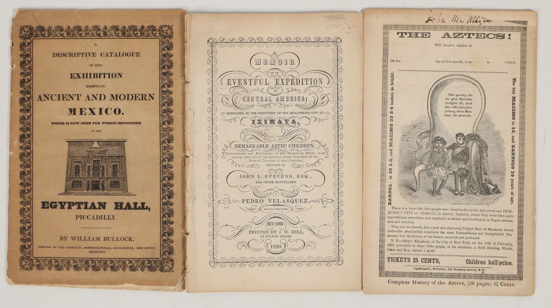 Lot of 3. 1. Descriptive Catalog Exhibition OF Ancient And Modern Mexico, 1825, 32 pages. Egyptian Hall Piccadilly , London. 2. Memoir of an Eventful Expedition In Central America, discovery of Iximaya. 1850, 35 pages. Also two remarkable Aztec children. 3. The Aztecs, 1850, 8 pages. Discovery of two tiny children in the Idolatrous City of Iximaia, receiving visitors. All are in good condition in separate envelops.