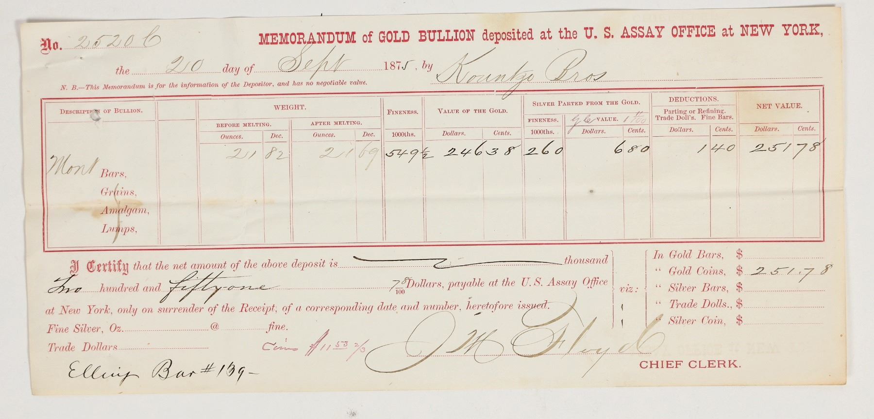 Deposited on Sept. 20th, 1875 by the Kountze Bros. on behalf of Henry Elling (Virginia City, Montana banker). Description of bullion lists "Mont" for Montana, 0.5495 fineness gold, 21.69 ounces. Signed by chief clerk JM Floyd. Notation bottom left corner "Elling Bar $139." 5 x 11" Folds, stains.