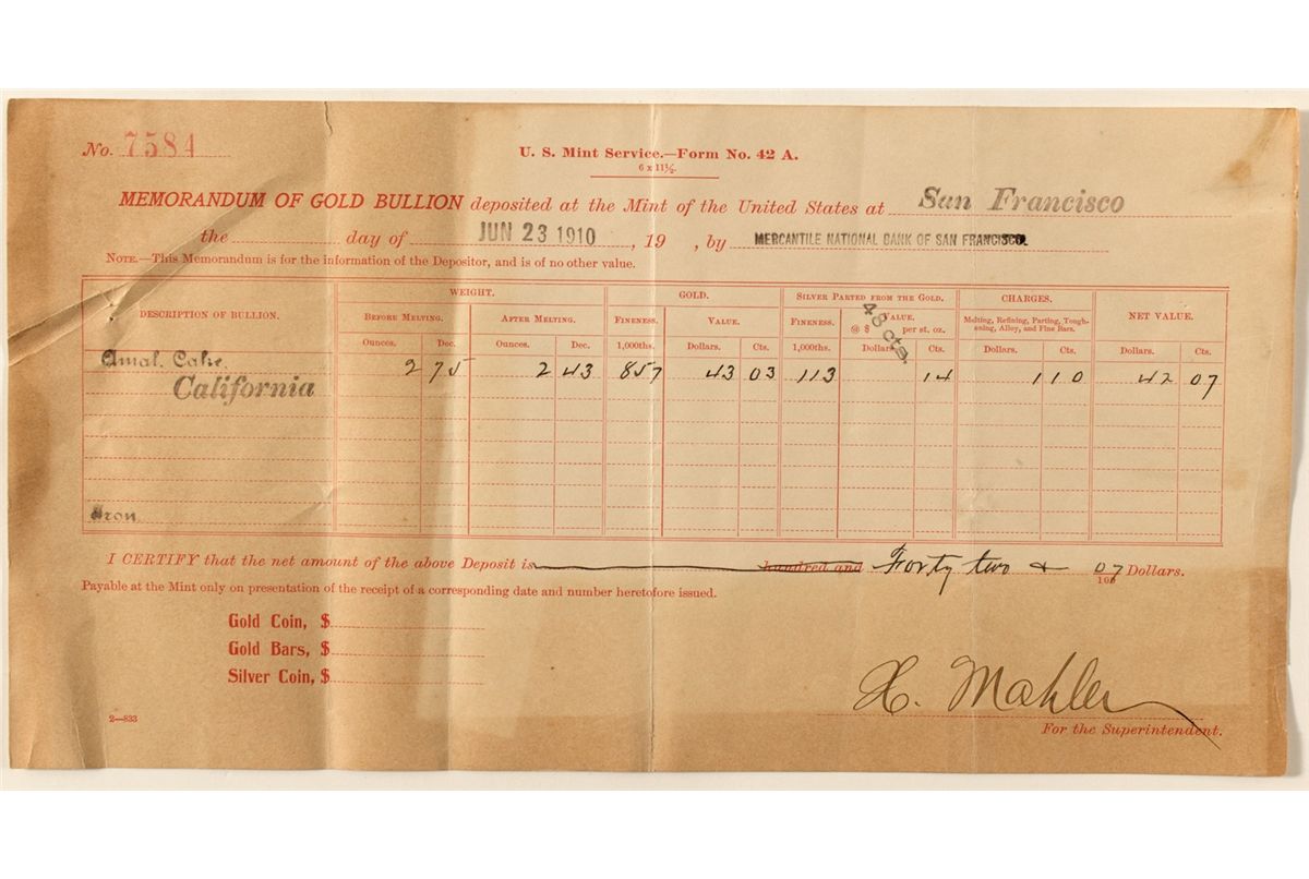 2 _ ounce bar that was .857 fine. $42.07 deposited to Mercantile National Bank. Signed by H. Mahler. Folds and some fading. Date: 1910 San Francisco CA hwac 21338