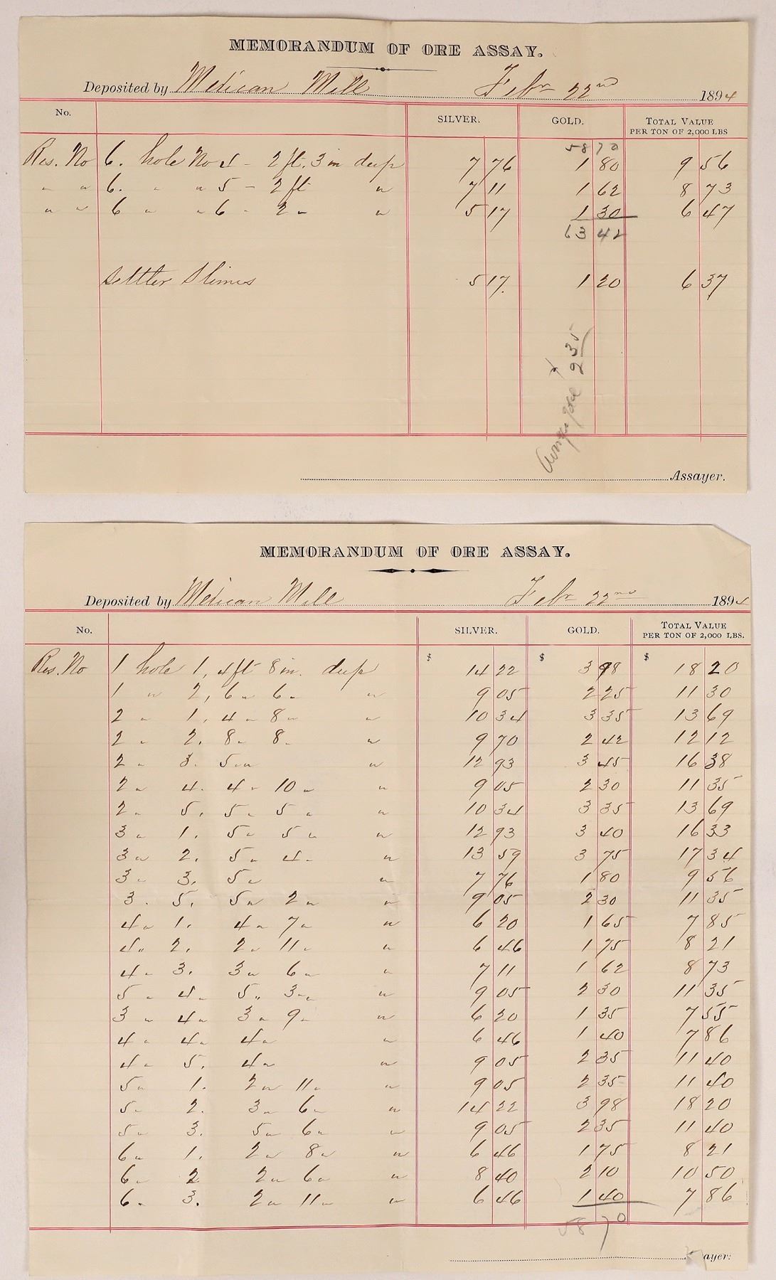 Two-page report of ore assayed in February 1894 for deposits by the Mexican Mill. These reports came out of the William Sharon Archive and were tied to Sharon's Union Mill & Mining Company. Shows the analysis of 27 samples of ore drilled from 6 locations. The notations include depth, which lead us to believe these were samples of mill tailings. The Mexican Mill was located on the Carson River, about a half a mile from Empire City. In 1863, it had the largest water wheel on the West Coast [Ref:Ansari]. It is now the site of the BLM office. Sheets are 8.5 x 9" and 5.5 x 8.5". Virginia City Nevada Franklin Collection