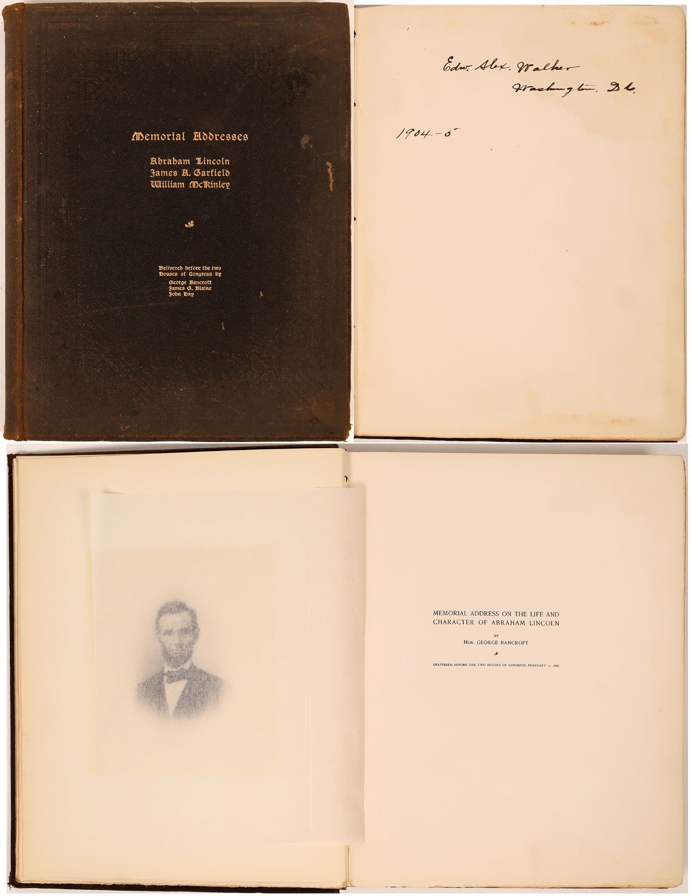 Hardcover, government printing office, 1903, 246 pages, 10 x 12 inches. Delivered before the two Houses of Congress by George Bancroft, James G. Blaine and John Day. Fifteen thousand copies of this volume were authorized by Congress. The three memorials were delivered: 1866 (Lincoln); 1882 (Garfield); and 1902 (McKinley). Rare, very good condition.