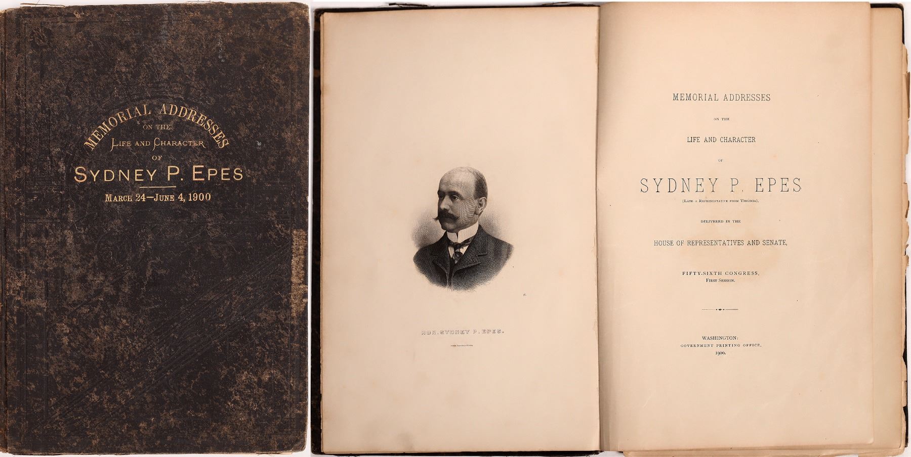 Memorial Addresses on the Life and Character of Sydney P .Epes, March 24-June 4, 1900. 72 pp, p15 detached, pencil writing on back blank page, spine detaching, please inspect.