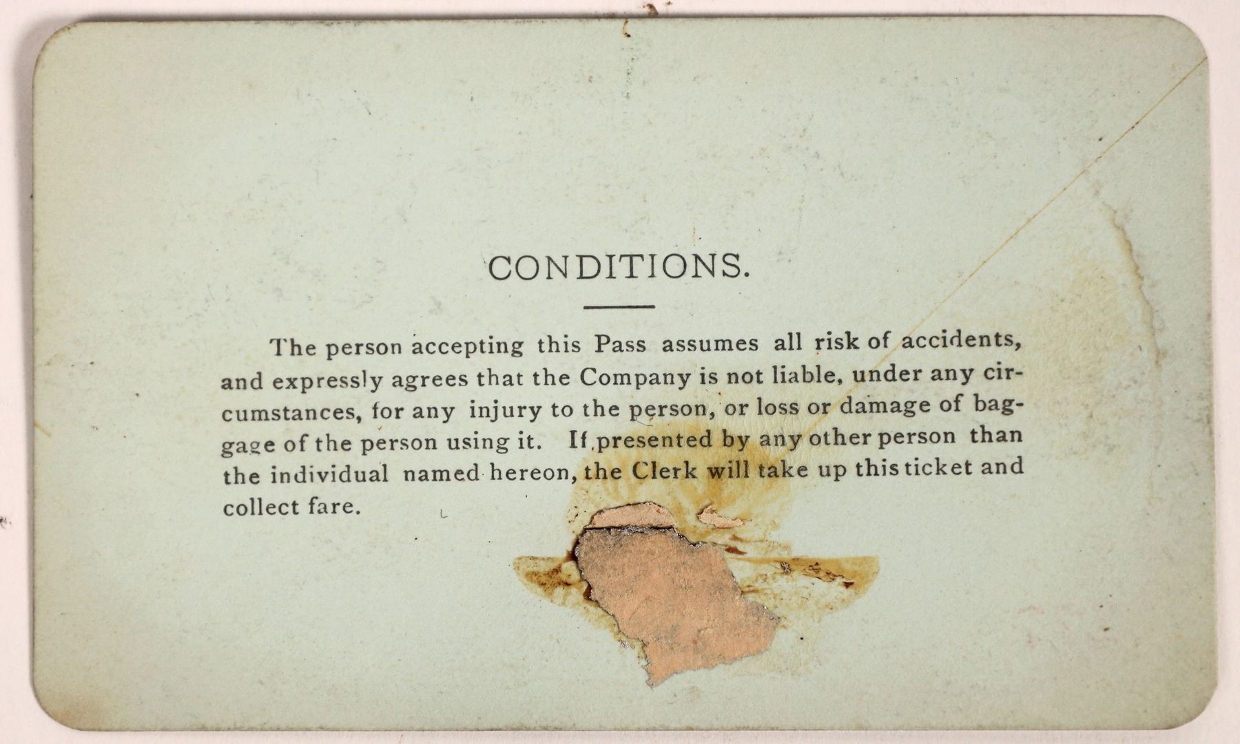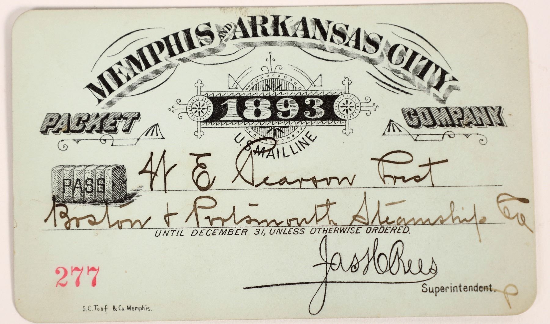 US Mail Line. Pass no. 277, issued for 1893 to WE Pearson, president of Boston & Portsmouth Steamship Company. Preprinted signature of superintendent Jas. H. Rees. Black print on light green cardstock with small vignette of package incorporated into the design. Printed by SC Took & Co. Memphis. Some glue/paper residue on reverse. Operated the steamer Kate Adams on the Mississippi River from Memphis to Arkansas City, Arkansas, 252 miles.