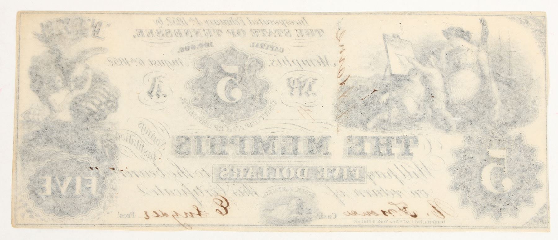 Not found in Haxby. August 6th 1852, The Memphis Savings Institution, will pay to the bearer five dollars. Signed by cashier and president; lithography by Danforth, Bald & Co. 7 x 3 inches.