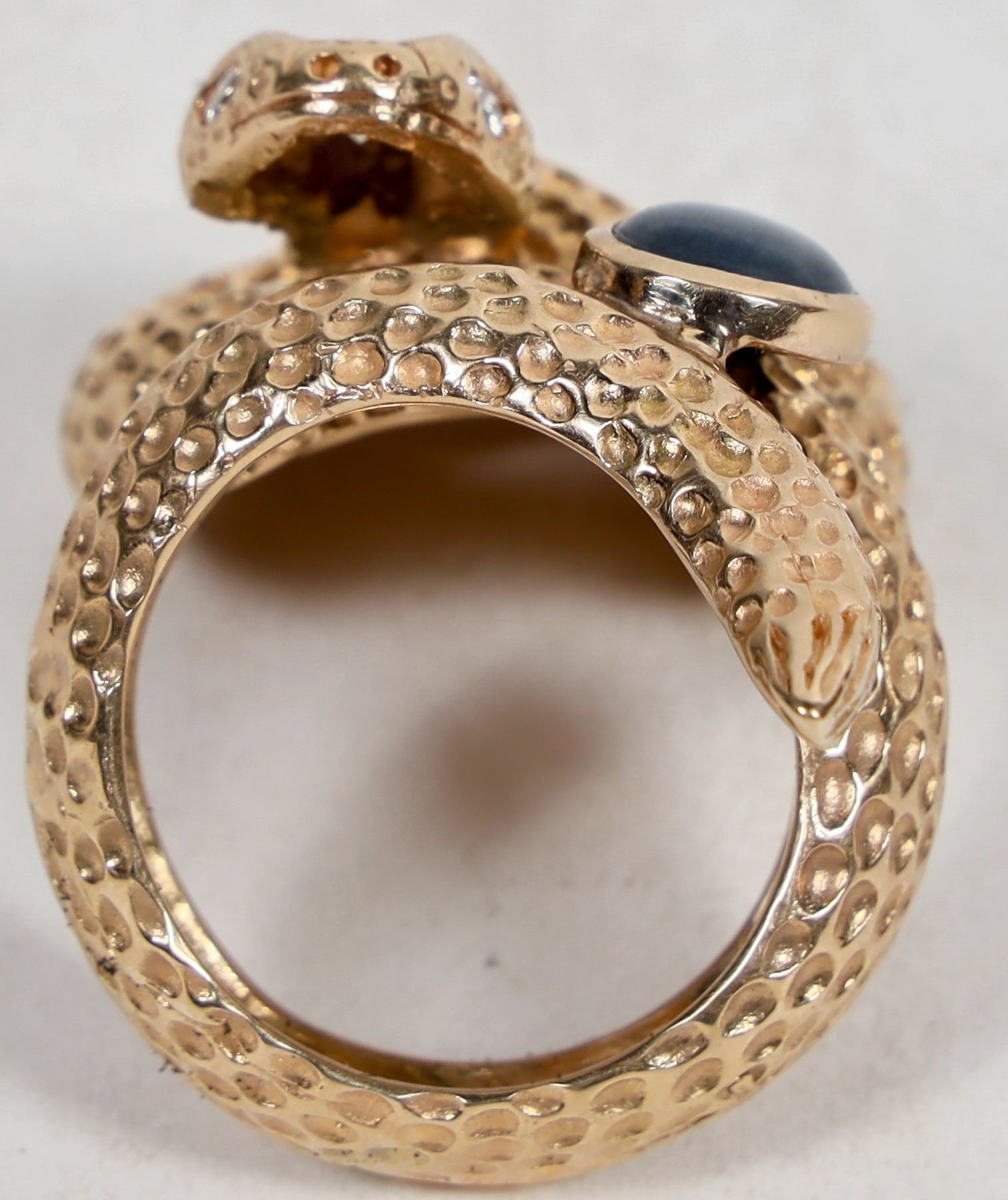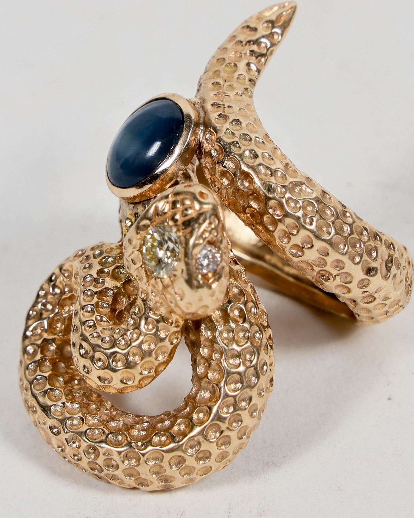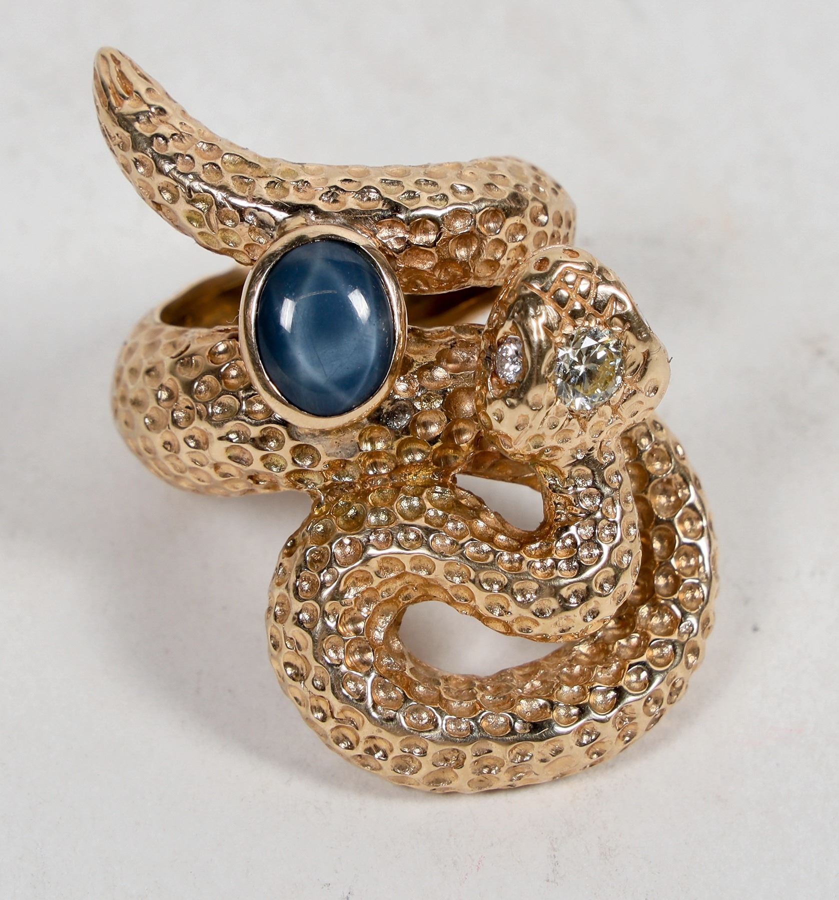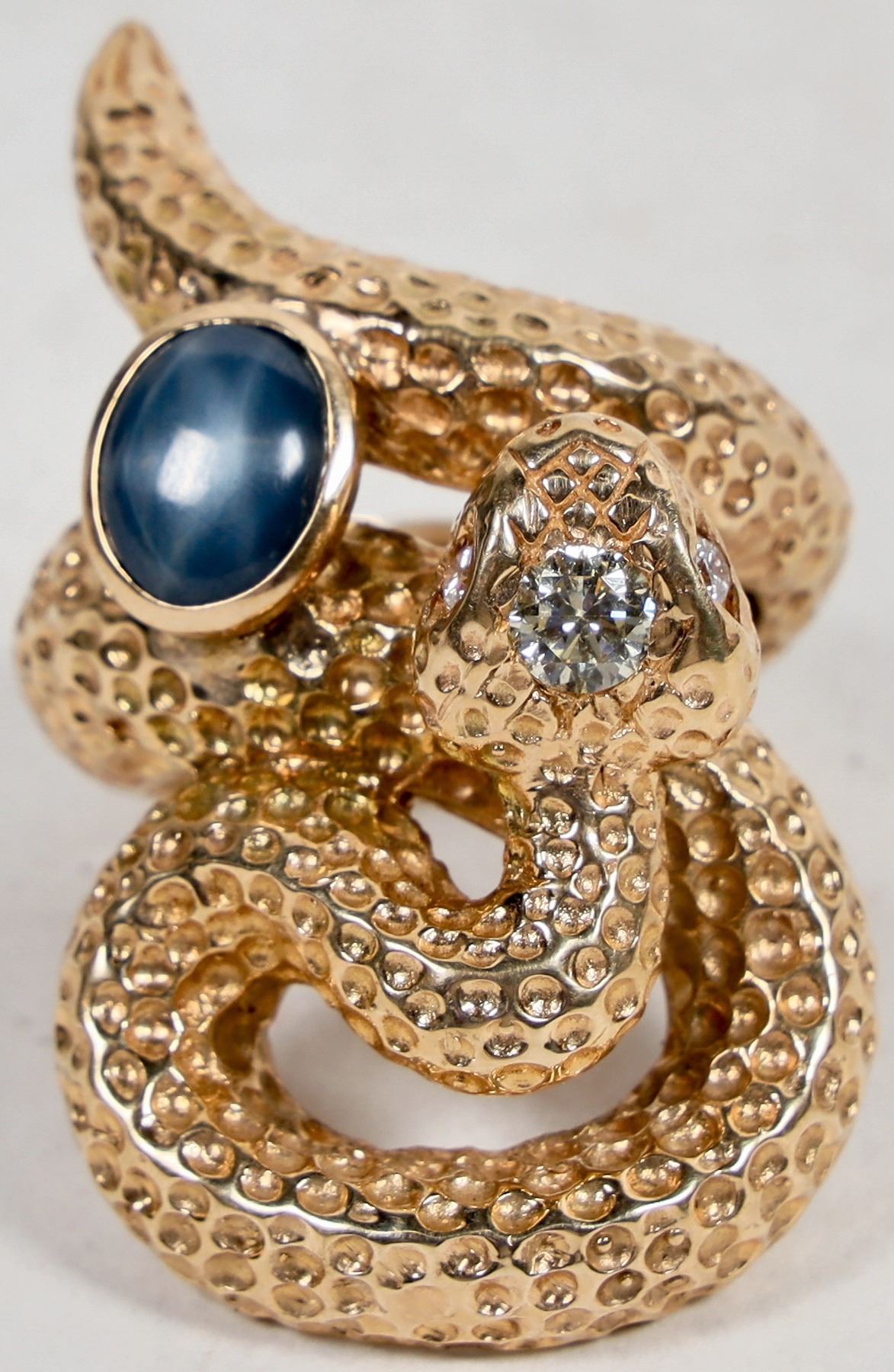 Men's' 14-Karat Snake Ring w/Blue Star Sapphire Approx. size: 9.5. Authenticated/appraised by Stucki Jewelers, Grass Valley, CA in June 2019. Stamped 14-karat, yellow gold, snake ring. Bezel-Set above the ring shank attaching the tail and the midsection of the snake, is one oval cabochon natural, blue-star-sapphire with fine 6-pointed star, measuring 9.8-7.6mm x 3.5mm. Flush-set in the sop of the snake's head is one round brilliant-cut diamond measuring 4.5mm and weighing .35 carat, with fancy-light yellow color and SI-1 clarity. Flush-set for each of the snake's eyes is one round brilliant-cut diamond measuring 2.5mm and weighing .06 carat, both with a color of H and clarity of sI-1. The ring has an overall measurement of 46.6mm in length and 26.5mm in width. The ring shank measures 9.6mm wide. The overall weight of the ring is 34.9 grams. Appraised Value in 2019: $5,750.Appraisal included. This is a unique, eye catching, solid gold piece that will definitely attract attention.