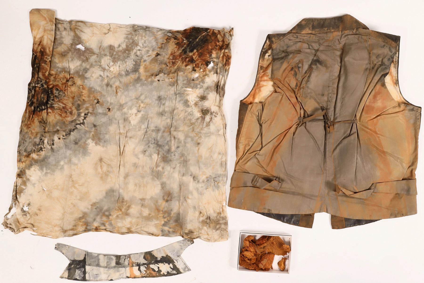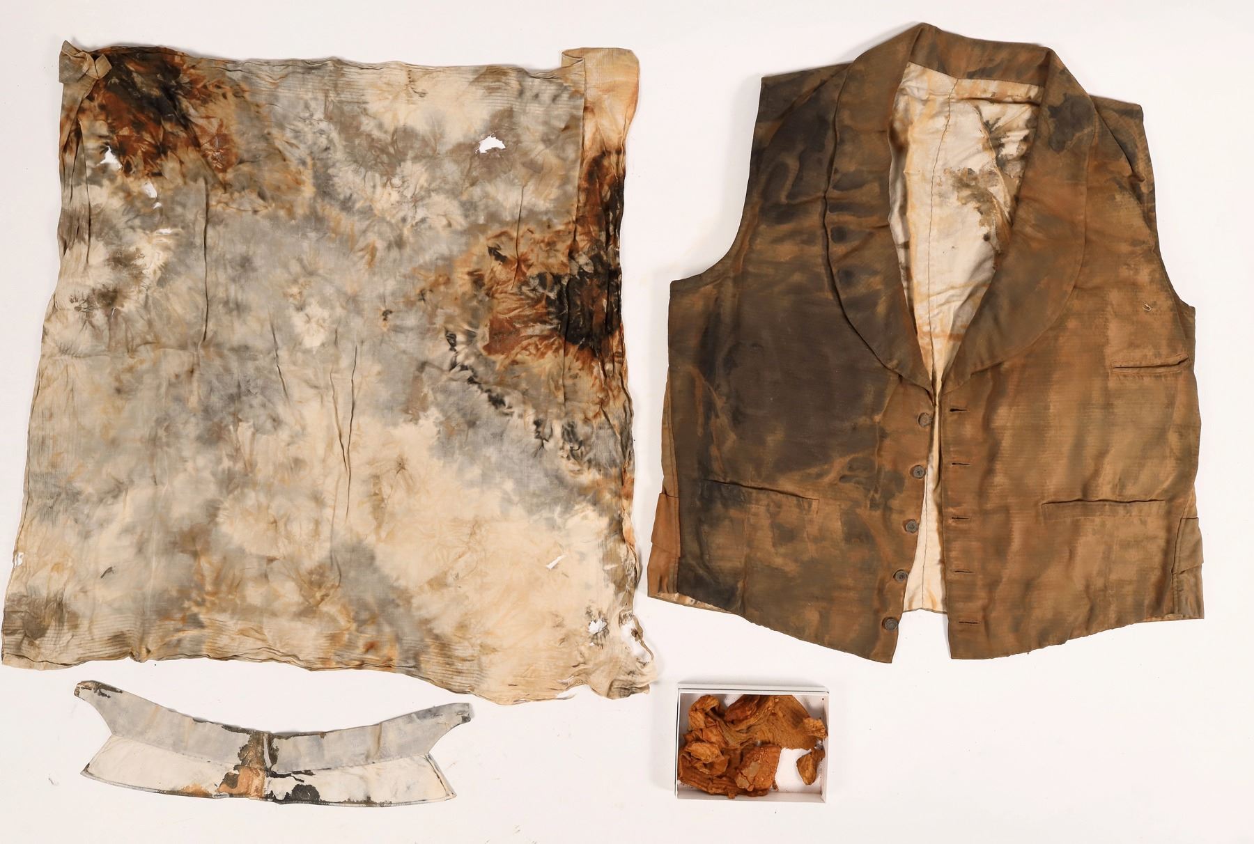 4 articles recovered from the John Dement trunk found at the S.S. Central America shipwreck. 1.) Three Hole Men's Collar 3" x 15", from the Dement trunk. good condition. 2.) Five button cotton vest (all five buttons present, but all had matching cloth coverings of which four are present), two pockets, with watch pocket above left pocket. Dual tie back, one at center and one at bottom. Front with reflective fibers and horizontal patterns, creating a horizontal pin stripe pattern. The horizontal pattern is in the weave using a lighter colored thread to create the lines. 22" tall, 33" waist. Cotton lining. 3.) John Dement Handkerchief, 24" square, degradation along two sides. Parallel lines along all four sides. 4.) Ribbed pattern sock fragment. About 5.25x4" with folds. Degraded condition.