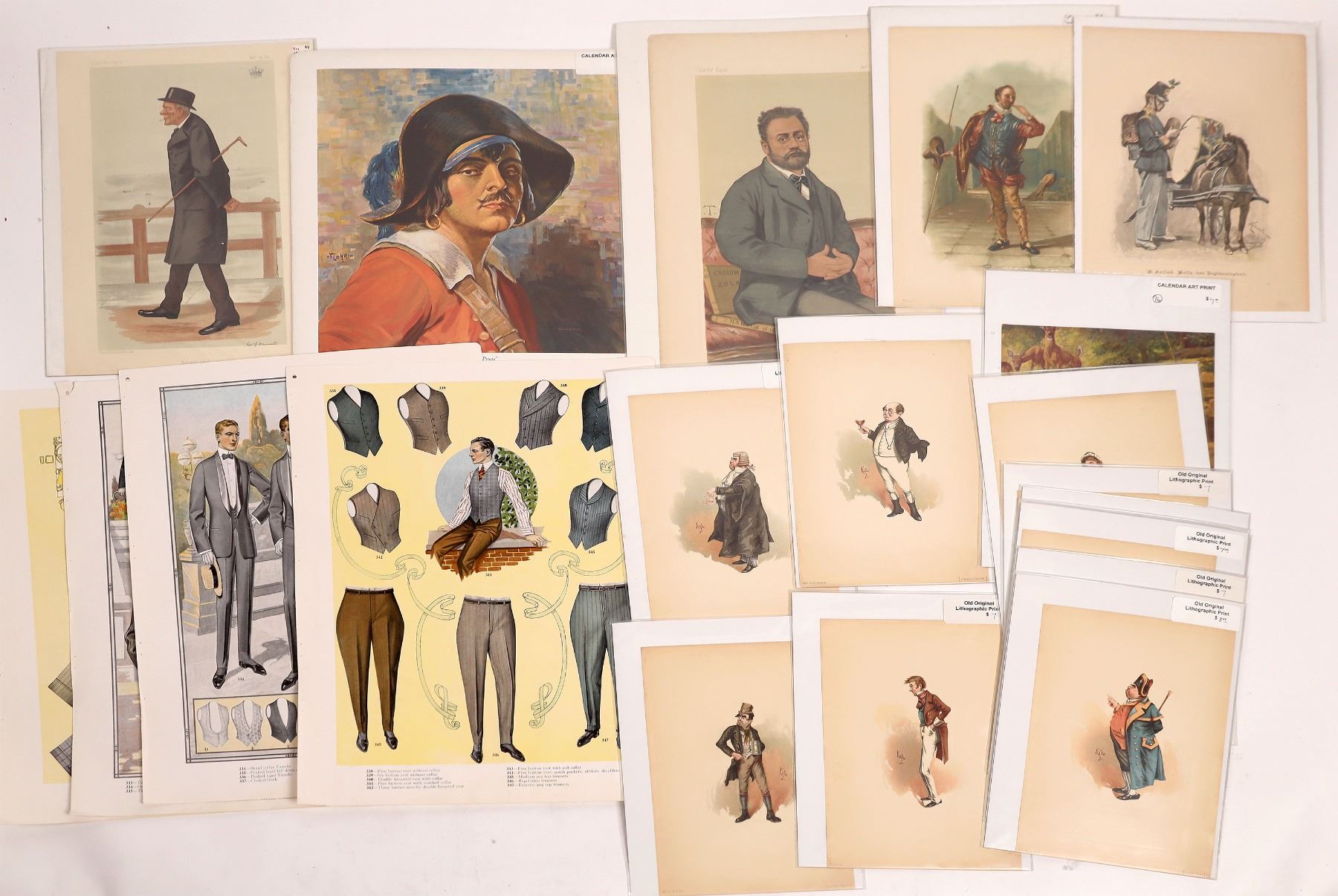 Lot of 21 prints depicting men's fashion, mostly late 19th century. 17 mounted w/plastic coverings. 2 labeled as Calendar Art Prints. 11 lithos from a series signed by Kyd w/dimensions 11" x 8 1/2". Other mounted prints sized up to 12" x 16 1/4", Four unmounted prints are advertising posters, no identifying marks, dimensions: +/- 14" x 18". All in excellent condition.