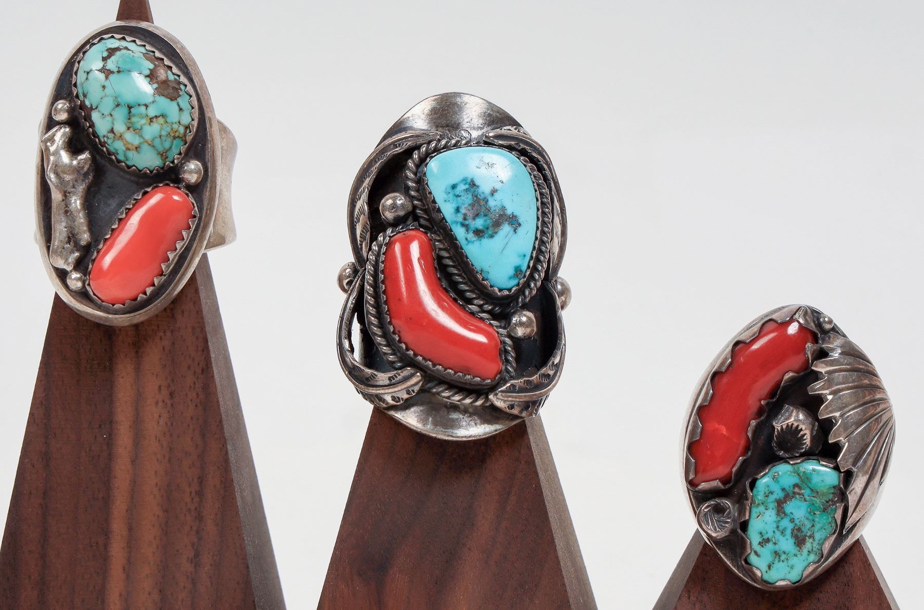 Three large sized men's rings with turquoise and coral stones in each silver setting. Ring sizes as pictured from left to right: 10.5, 11, 10 [] [] [] [] []