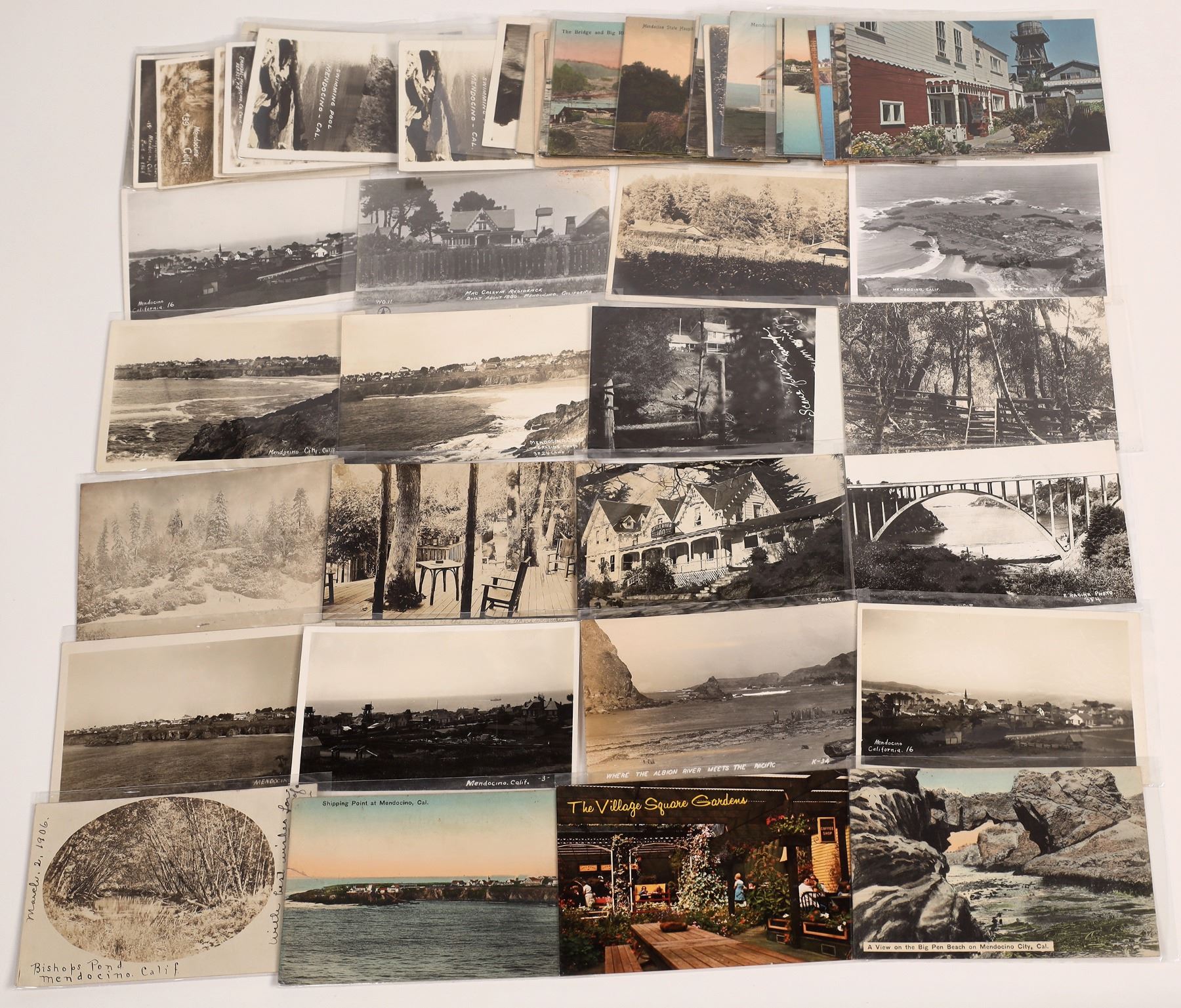 Lot of 45 including 24 real photo postcards, 3 undivided back cards, and rest are divided back. Includes views of: Mendocino State Hospital; rough sea at Mendocino Bay; bridge and Big River; Kasten Street; West Main Street; Mendocino High School; Big Pen Beach; Presbyterian Church; Russian Gulch Bridge; bird's-eye views; and multiple scenic shots.
