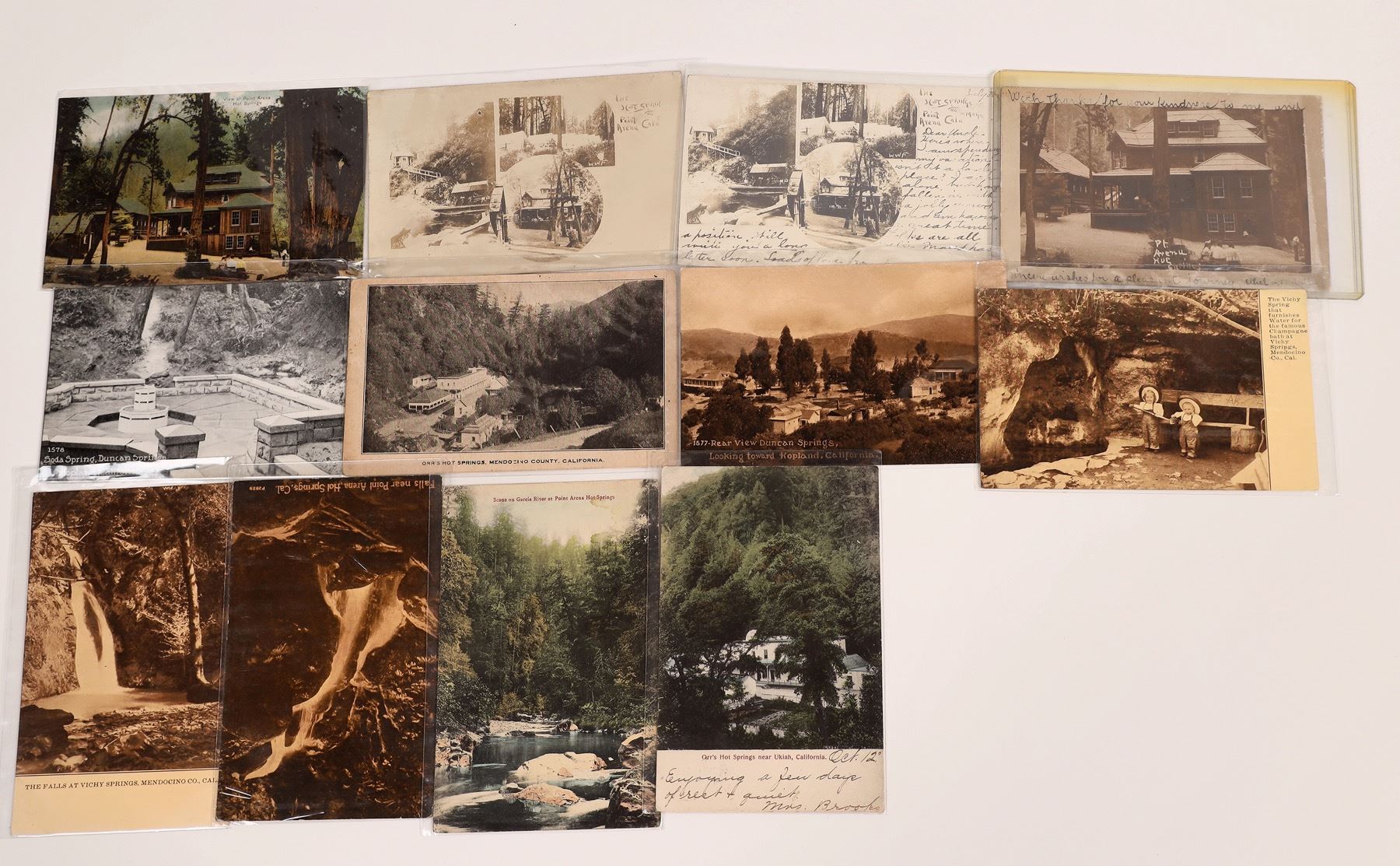 Lot of 12. 1) Point Arena Hot Springs. Six cards incl. three very rare real photo cards (two undivided back, mailed 1904 and 1907 x2), one amber card, and 2 divided back printed cards (1909 and 1914). Located along the Garcia River, the resort was founded in 1895 and opened to the public in 1904. 2) Other Mendocino County cards: two amber cards for the Vichy Hot Springs; two cards for Orr's Hot Springs near Ukiah (one undivided, one divided); and two cards (one amber) for the Duncan Springs at Hopland.