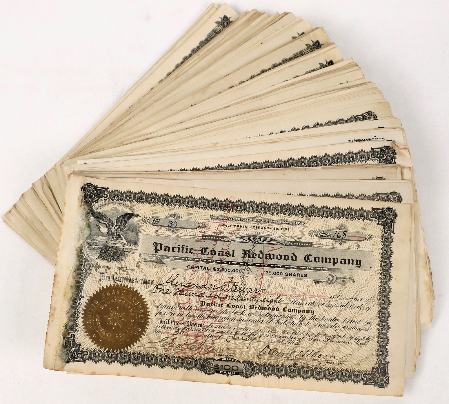 Mendocino County Lumber Stocks, 3 companies c.1900-1940 About 200. Pacific Coast Redwood Company, 2 varieties. Terminal Lumber Company. Union Redwood Company. All have gold embossed seals. Many have revenue stamps. See photos.