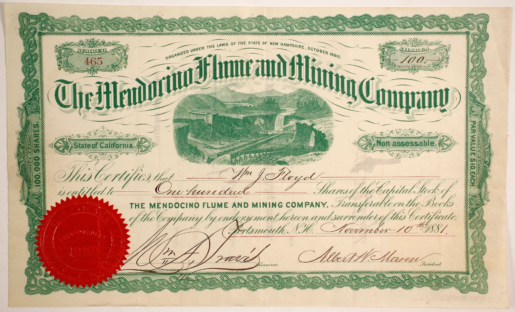 # 465 for 100 shares to William Floyd. Signed by William David and president Albert W Mann. Dateline Portsmouth, New Hampshire 1881. Incorporated October 1880. Not canclled. Red Seal. Green on white. Hydraulic mining scene. No pin hole, corner, edge or discoloration issues. Back has a brown stain. The purpose of the company was to construct a V flume from Leonard Lake to Calpella to derive income sending lumber and water to the Capella gold mines. State: California City: Mendocino Date: 1881