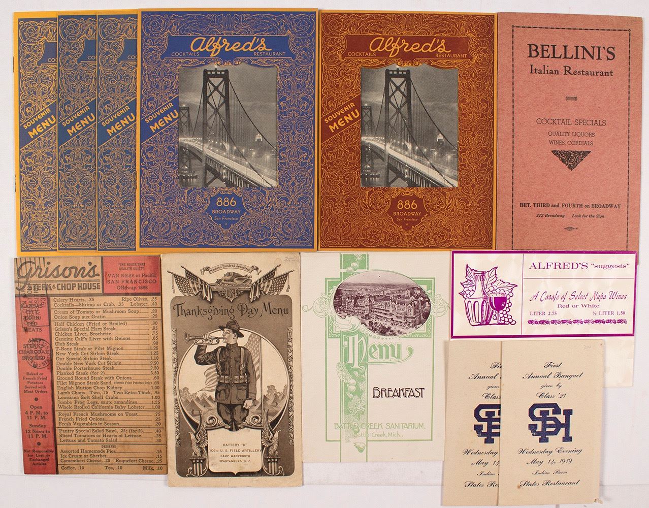 Breakfast menu from Battle Creek Sanitarium, Battle Creek, Michigan, from 1902; Alfred Cocktails and Restaurant Souvenir Menu from San Francisco; Thanksgiving Day Menu, Battery "D" 106th U.S. Field Artillery, Camp Wadsworth, Spartanburg, S.C. (1917); and more Date: Location: HWAC# 55138