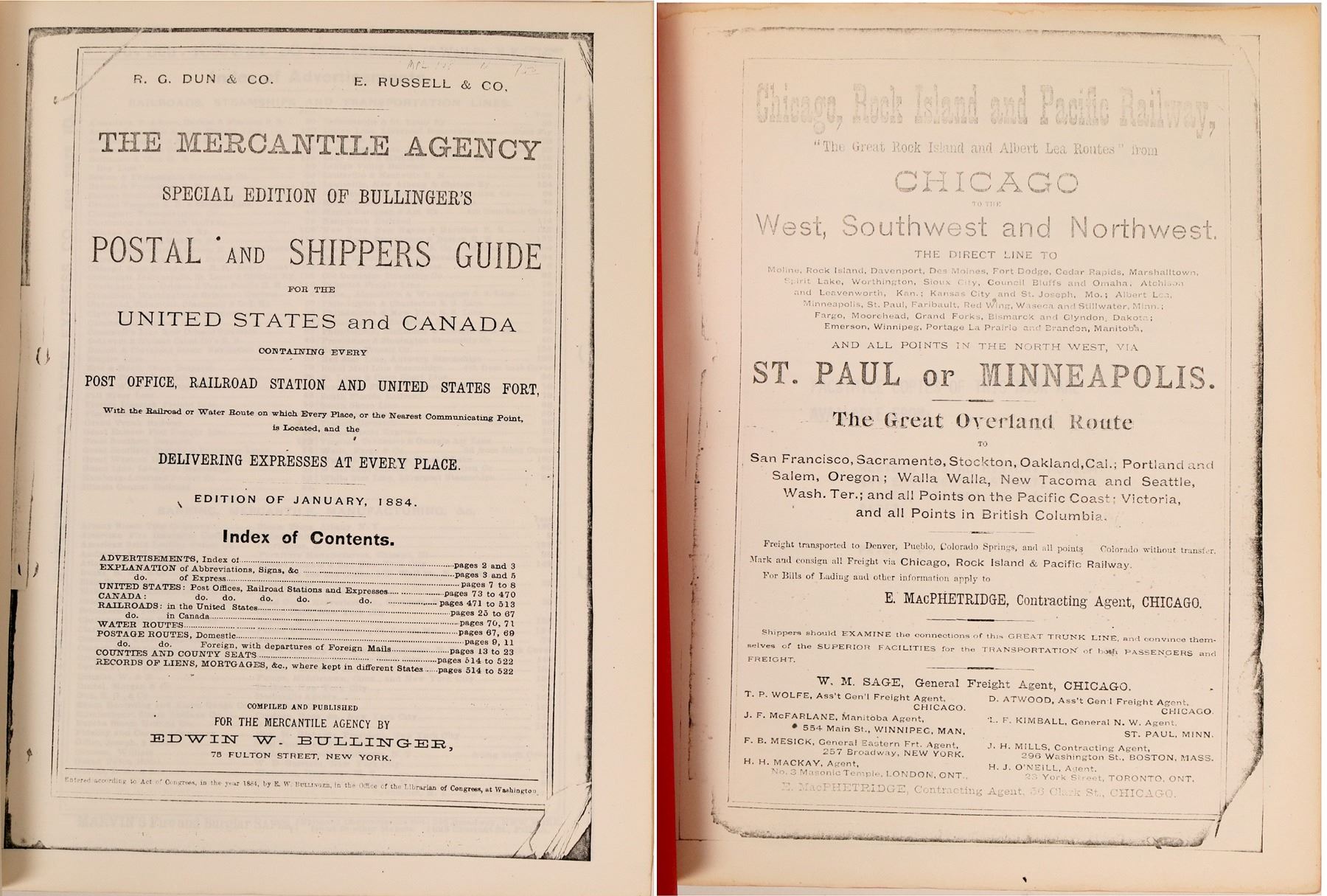 Lot of 1. Mercantile Agency the R G Dun and Company, Postal and Shippers Guide. 1884. Xerox copy of directory. Postal and shippers guides for the US and Canada containing post offices, railroad stations,railroads, coastlines, and US Forts.