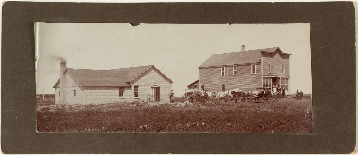 Photograph of 3 buildings in the small Montana establishment of Eddy that appears to be two houses and a business. On the back one of the previous owners wrote "Eddy where Ragnhild worked 1907-1911". This business was located in Sanders County and was one of the only business in town next to the railroad tracks on the side of the river. Fantastic western photograph. Mounted to board, 4" x 9.75". City: Eddy State: Montana, Date: 1907-1911 Inventory# 40858
