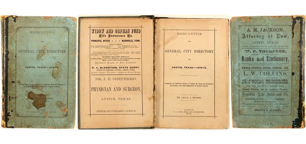 By Gray & Moore. "Containing an Interesting History of Austin, the Name and Residence of its Citizens, and Local Information of General Interest." This was Austin’s first directory! This original publication is very rare. For wealth of detail and statistics on local history, few sources can rival directories like this. 1,400 names are preserved for prosperity. Includes a translation of city names in 1872 and now. Binding is worn and stained, hinges cracked, but internally very good. 146 pages. [ii]City: AustinCounty: State: TXDate: