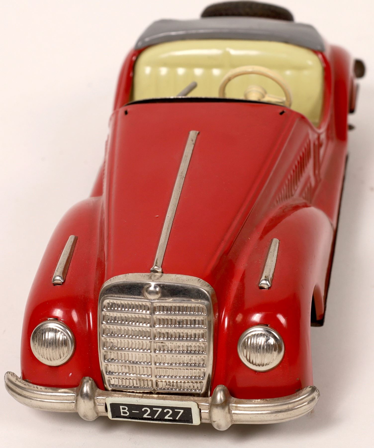 A Mercedes Benz toy car made from die cast metal. Car measures 10"x 4", has rubber tires and a working steering wheel. It is marked "Made in US Zone Germany."