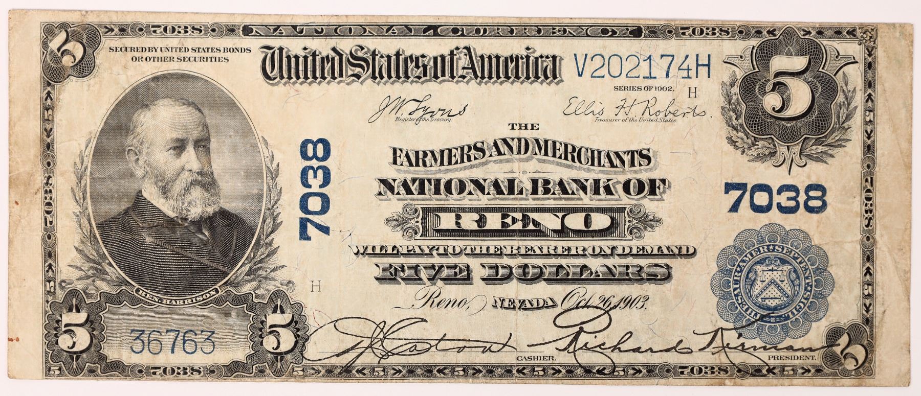 Reno, NV: 1902 $5 Plain Back Blue Seal Ch. 7038 The Farmers and Merchants National Bank of Reno Nevada S/N: 36763. Not seen in the Census in over 2 Decades and always popular, with only about a Baker's