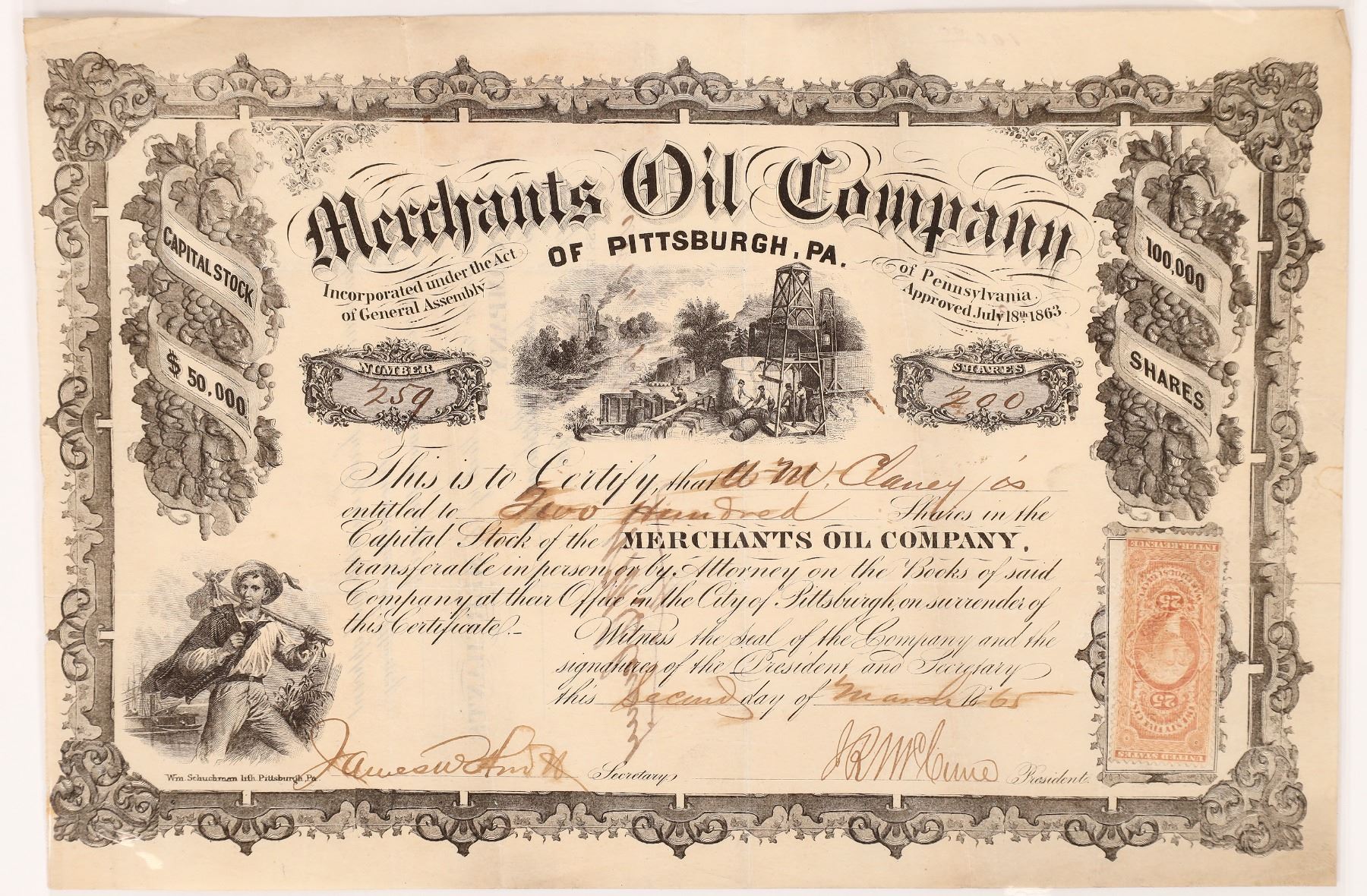 Inc. in PA, 1863. No. 259, issued for 200 shares to WM Claney in 1865. Signed by president McCune and the secretary (illegible). Ornate border with floral motifs plus two vignettes: oil barrels being loaded and man walking away from ship. Printed by Wm, Schuchman, Pittsburgh. 25 cent Warehouse Receipt stamp on front and 25 cent US IR protest stamp on reverse. 7.25 x 11" Folds, creases. Owned oil properties on Cow, Calf, and French Creeks in Pleasant County, West Virginia (The Pittsburgh Daily Commercial, 27 Feb 1865). Pleasant County West Virginia Ken Prag Collection