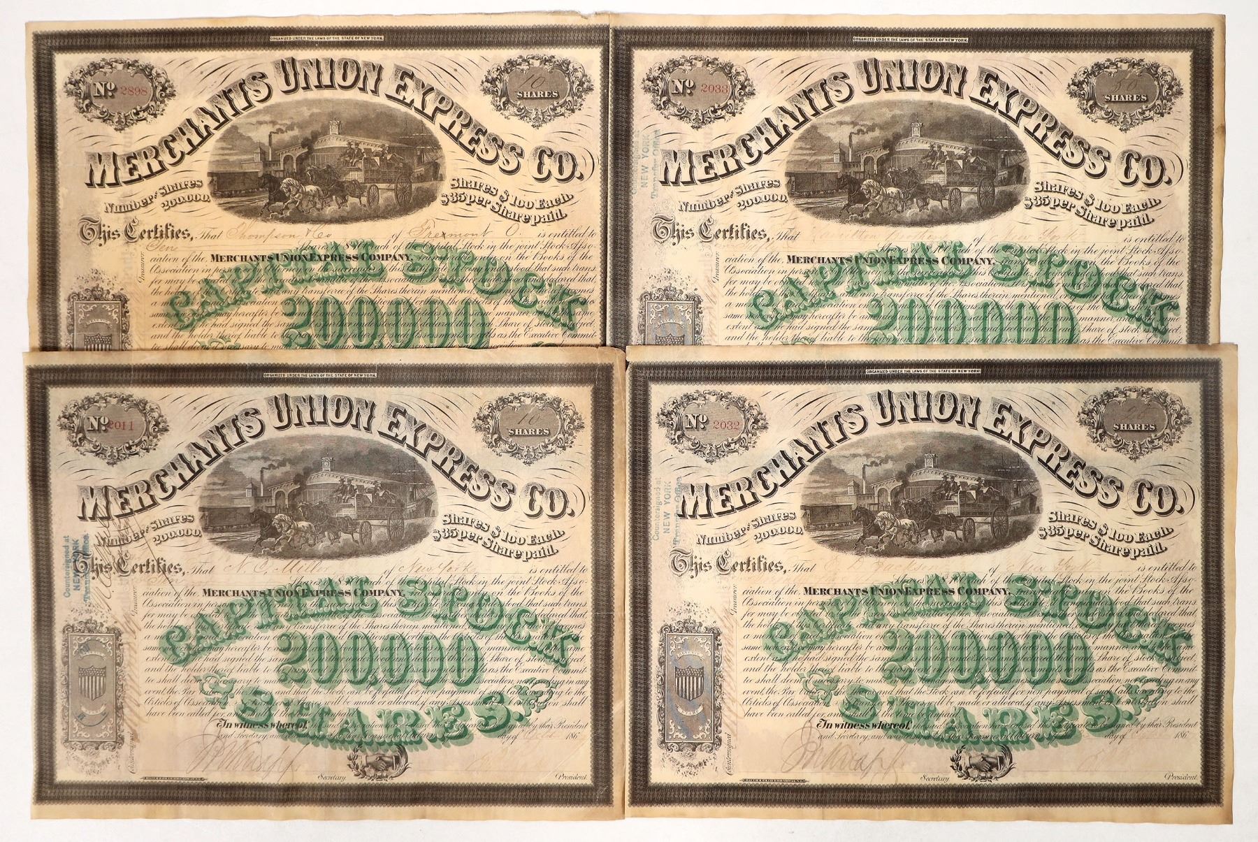 A group of 4 stock certificates from the Merchants Union Express Company, all dated 1867. Each certificate is signed by secretary J.N. Knapp and president E.P. Ross, though the Ross signatures are extremely faded. A faint cancellation stamp is visible on one certificate. They have excellent vignettes of a horse-drawn cart. Very toned with damaged edges. The Merchants Union Express Co. endured profound losses due to competition with American Express throughout the 1860s before being bought out by American Express and renamed the American Merchants Express Company with William G. Fargo appointed as president.