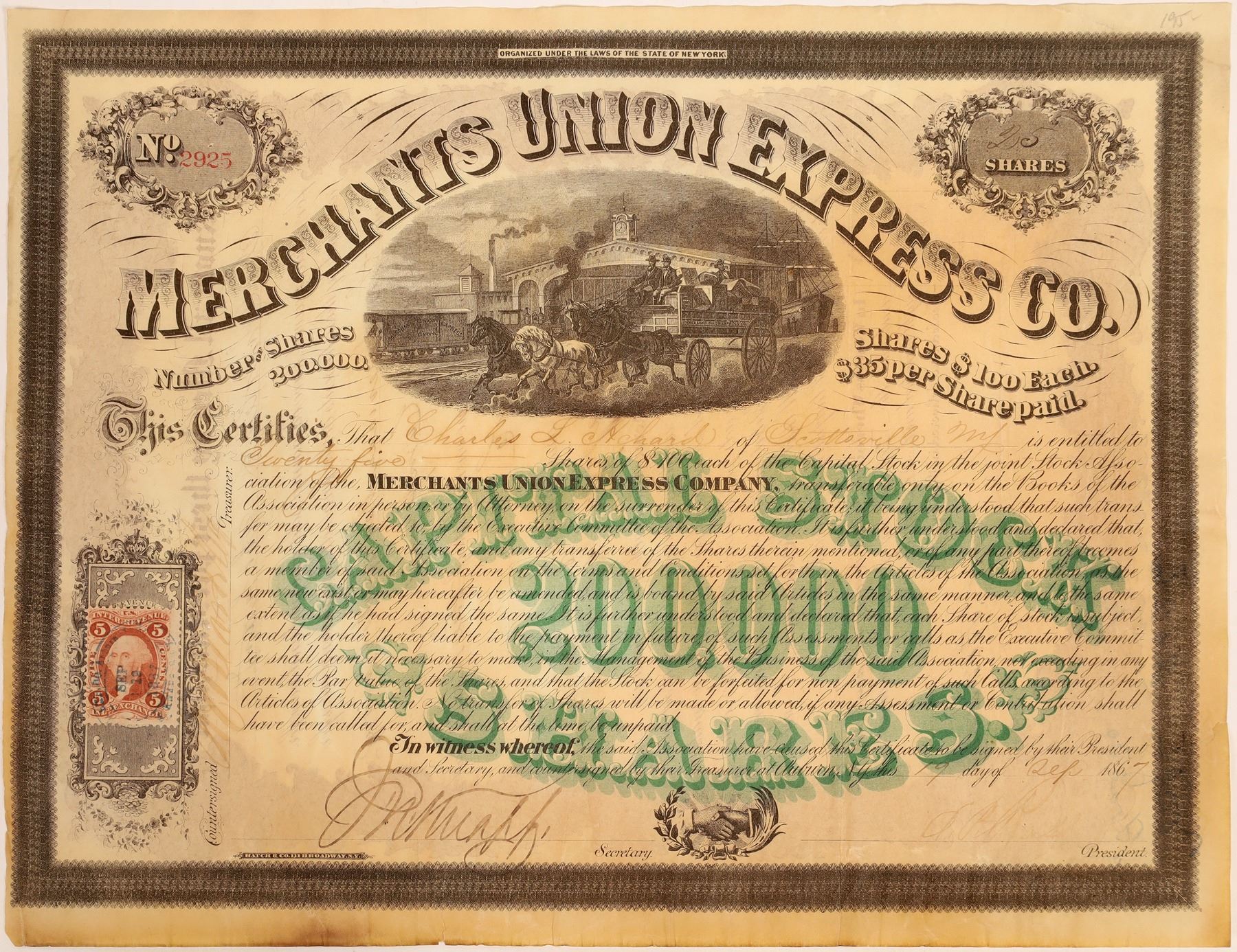 Inc. in New York. No. 2925 issued for 25 shares to Charles Achard of Scottsville, on Sept. 19th, 1867. Signed by president EP Ross, secretary Knapp and the treasurer (illegible). Transferred on the back to the American Merchants Union Express Company. Black border and green underprint, vignette of express wagon leaving train depot. Printed by Hatch & Co., NY. Endorsed on the reverse. 5 cent adhesive revenue stamp attached at bottom left. Heavy toning, creases, tears along edges, pinholes, some fading of the ink. Approx. 9 x 11.5" Near the close of the Civil War, Merchants Union Express was created specifically to compete with American Express and the Wells-Fargo-Butterfield-Livingston business family. The Merchants Union Express raised Cain with American Express. In a swift corporate move, American Express increased their capital stock to 18,000 shares on May 1, 1866, still with Wells, Fargo and Holland at the helm. This increase in capital would allow the Company the freedom to buy other express, steamship or rail lines to strengthen their hold on a monopoly of the express business east of the Missouri River. The prospect of purchasing the Merchants Union Express was a long one. Finally, Capital Stock was issued and the companies merged November 25, 1868, allowing for a new company to emerge, The American Merchants Union Express Company.