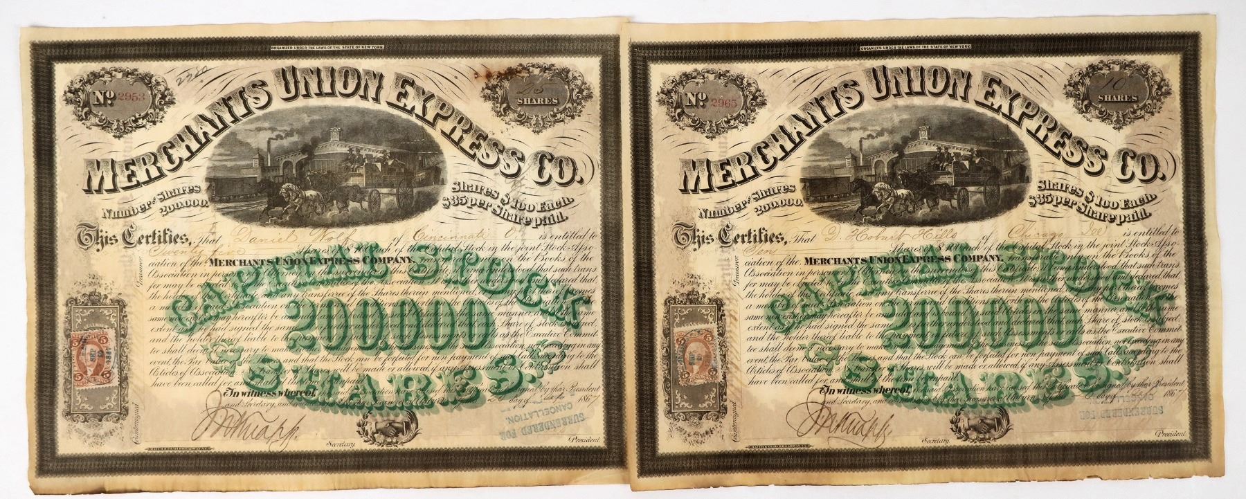 Lot of 2 stocks issued in 1867, stamp cancelled. Signed by Ross and Knapp. Both have a 5 cent adhesive revenue stamp attached. This company was the competitor to American Express before they merged.