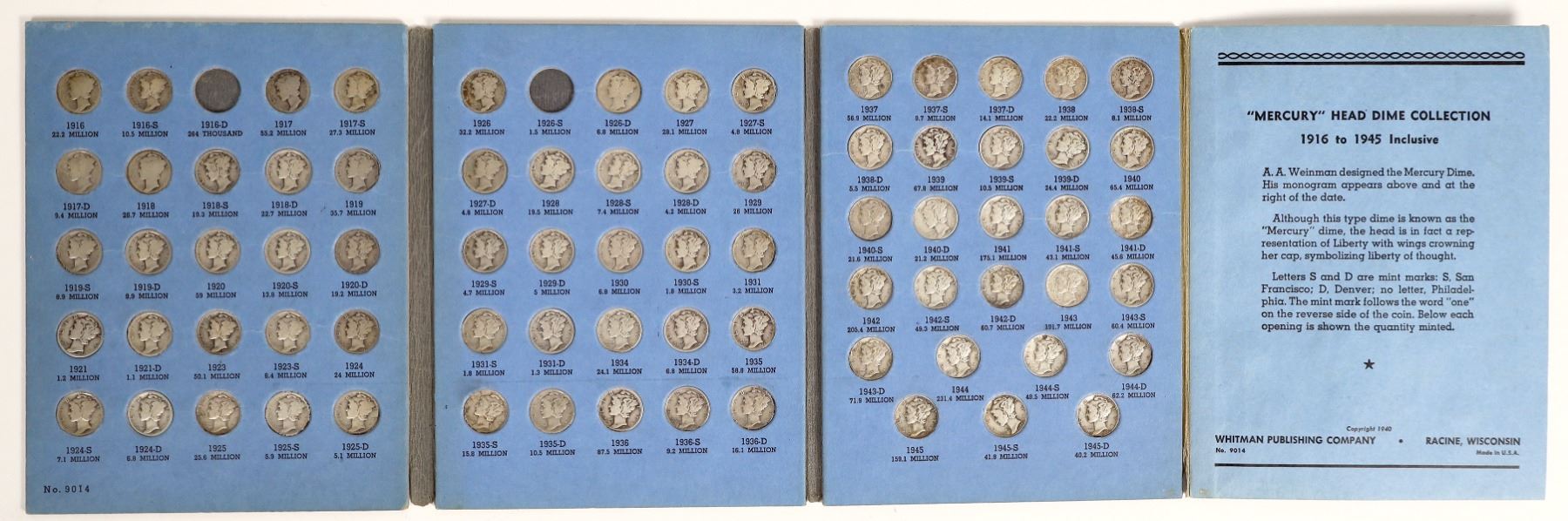 Blue Whitman Publishing Company No. 9014: Mercury Head Dime collection 1916 to 1945. 75 dimes in place with only the 1916-D and the 1926-S holes vacant. But the 1921 spot is holding a 1943 dime.