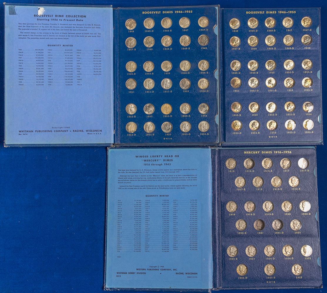 Mercury dime collection in three albums, missing the key dates, 1916D - 1921, 1921D, 1917 D and 40/41. All circulated. From good to xf. A nice collection. Also includes an uncirculated Roosevelt dime collection from 1946 through 1953. And, includes a second set of Roosevelts from 1946 through 63 approximately in uncirculated condition. Date: Location: HWAC# 58228