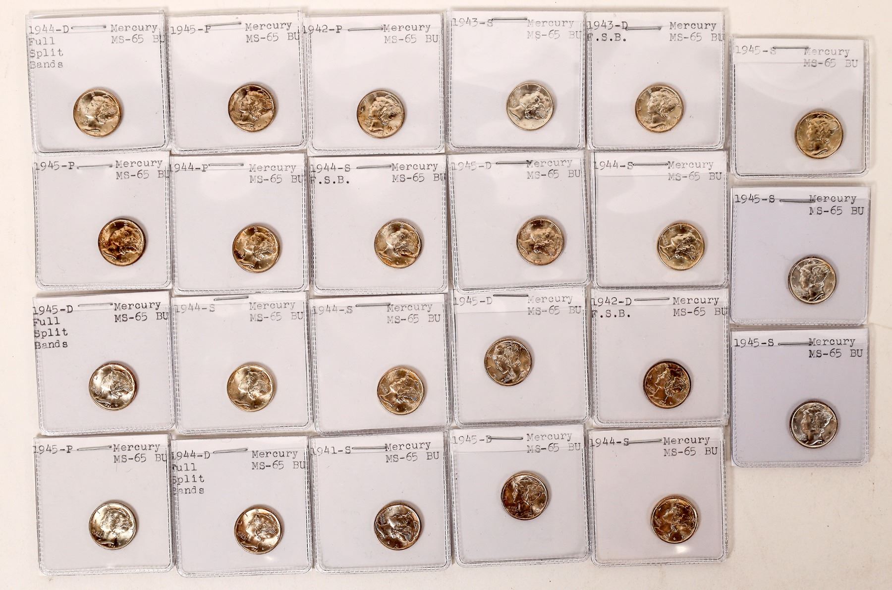 Lot of 23 MS 65 Mercury dimes: 1941-S; 1942; 1942-D; 1943-D; 1943-S; 1944; 1944-D (2); 1944-S (5); 1945 (3); 1945-D (4); 1945-S (3). Five are labeled full split bands.