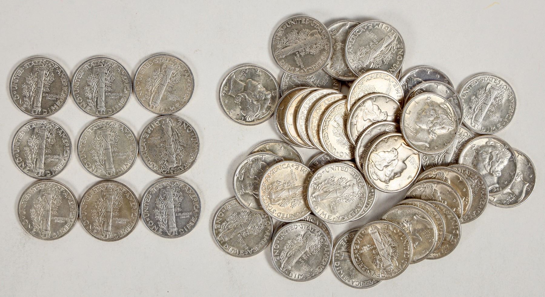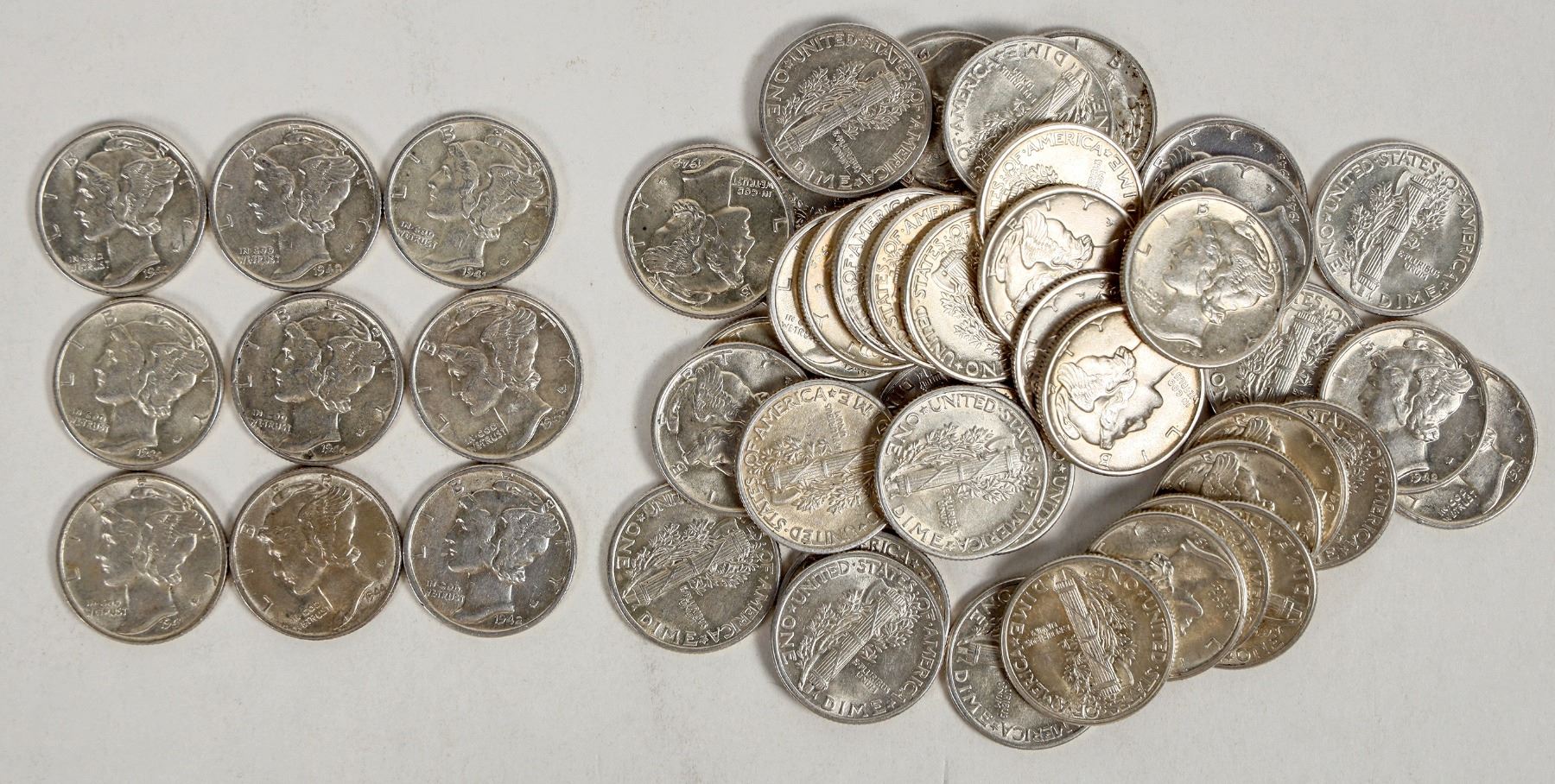 Roll of 40 Mercury dimes from the 1930s and 1940s, all in AU-BU condition.