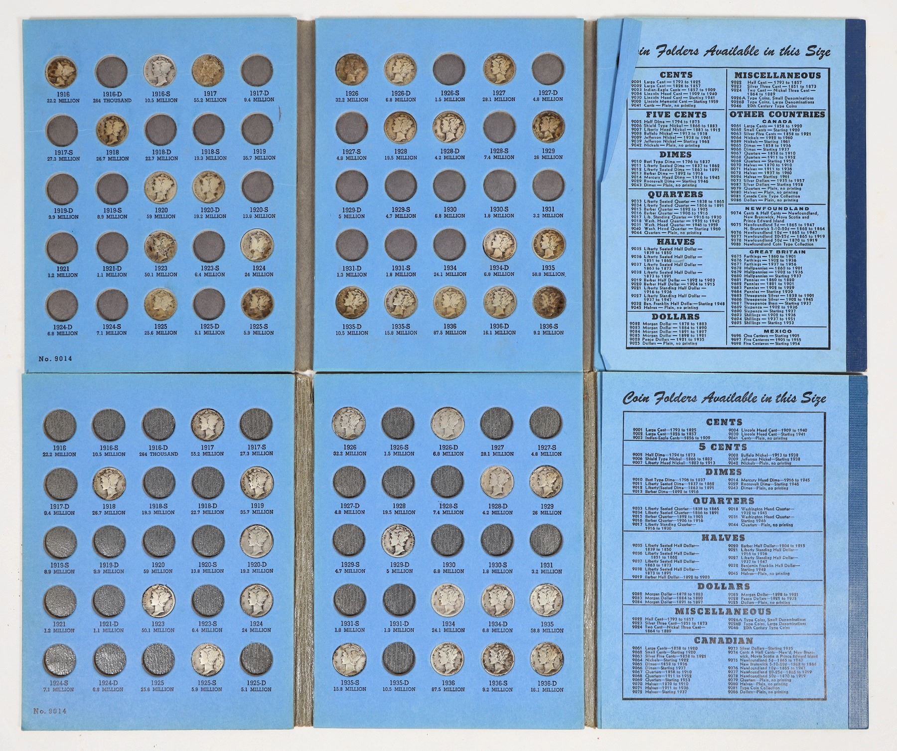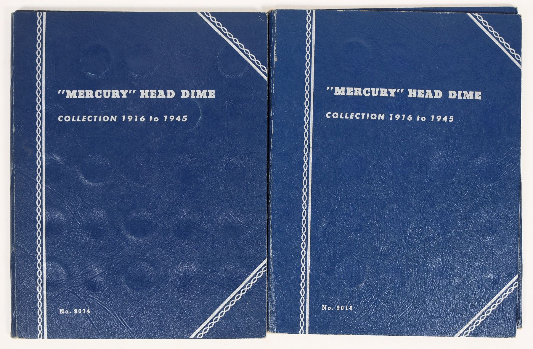 Two blue Whitman coin albums #9014 "Mercury" Head Dime collection 1916 to 1945. 1) 51 coins, complete after 1934. 2) 44 coins. Dates and mint marks have not been verified. All coins circulated, AG-EF condition.