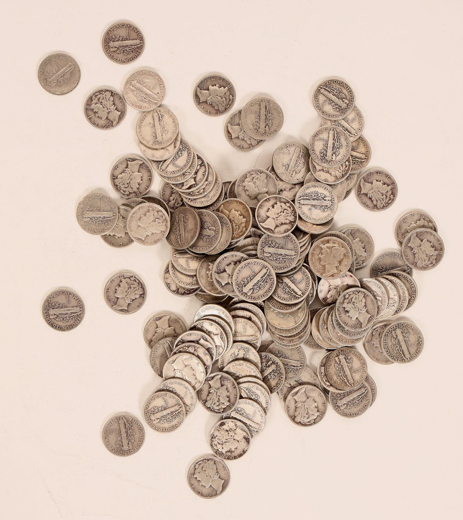 Mixed dates of 1940s Mercury dimes, 150 coins. Average circulated, G-EF condition.