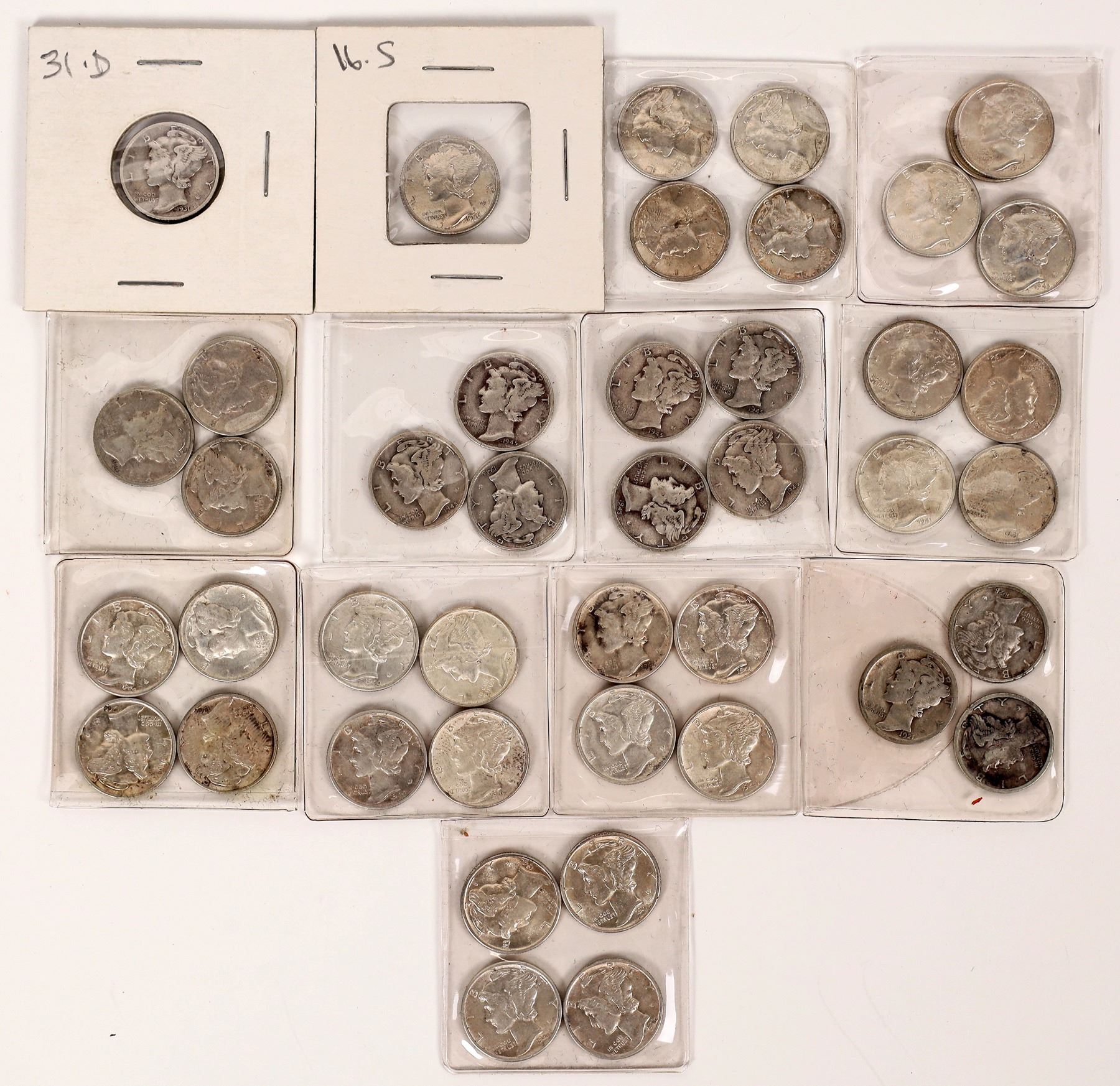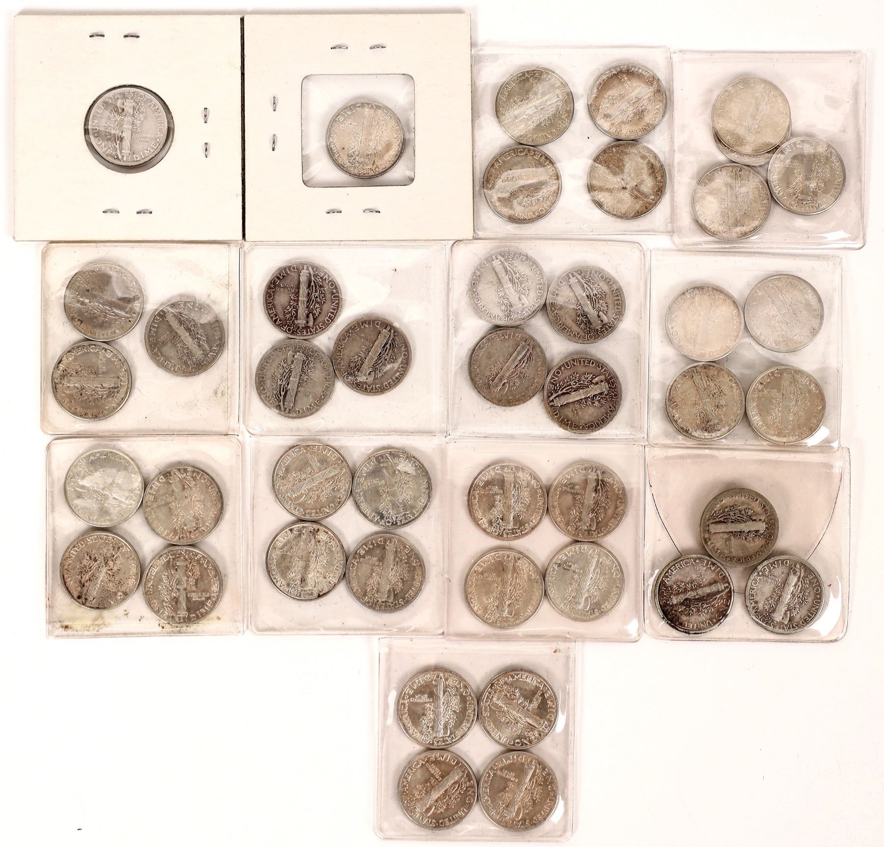 Lot of 43 Mercury dimes. Some AU-BU, some early dates like 1916-S, 1931-D.
