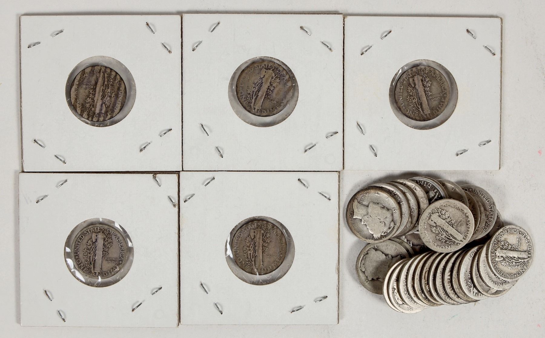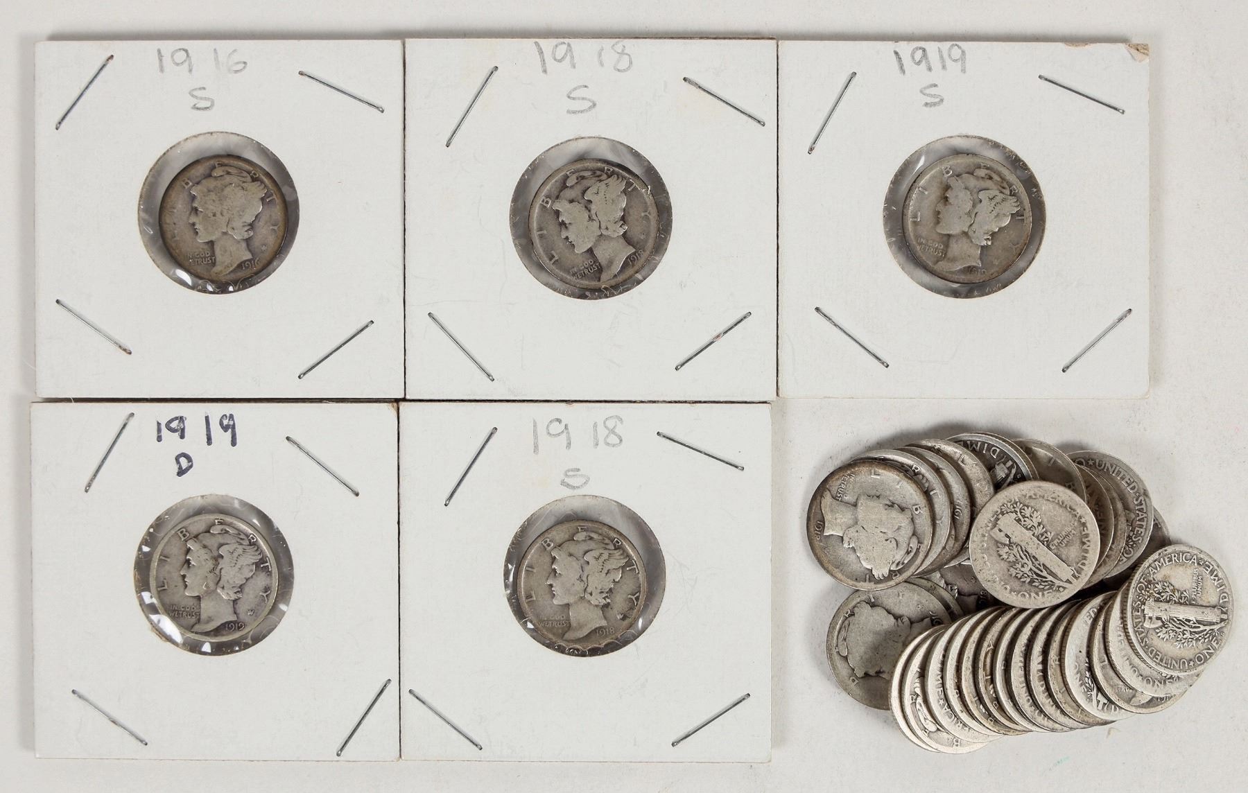 Thirty five Mercury dimes dated between 1916 and 1919. Most V-VG, some F-EF.