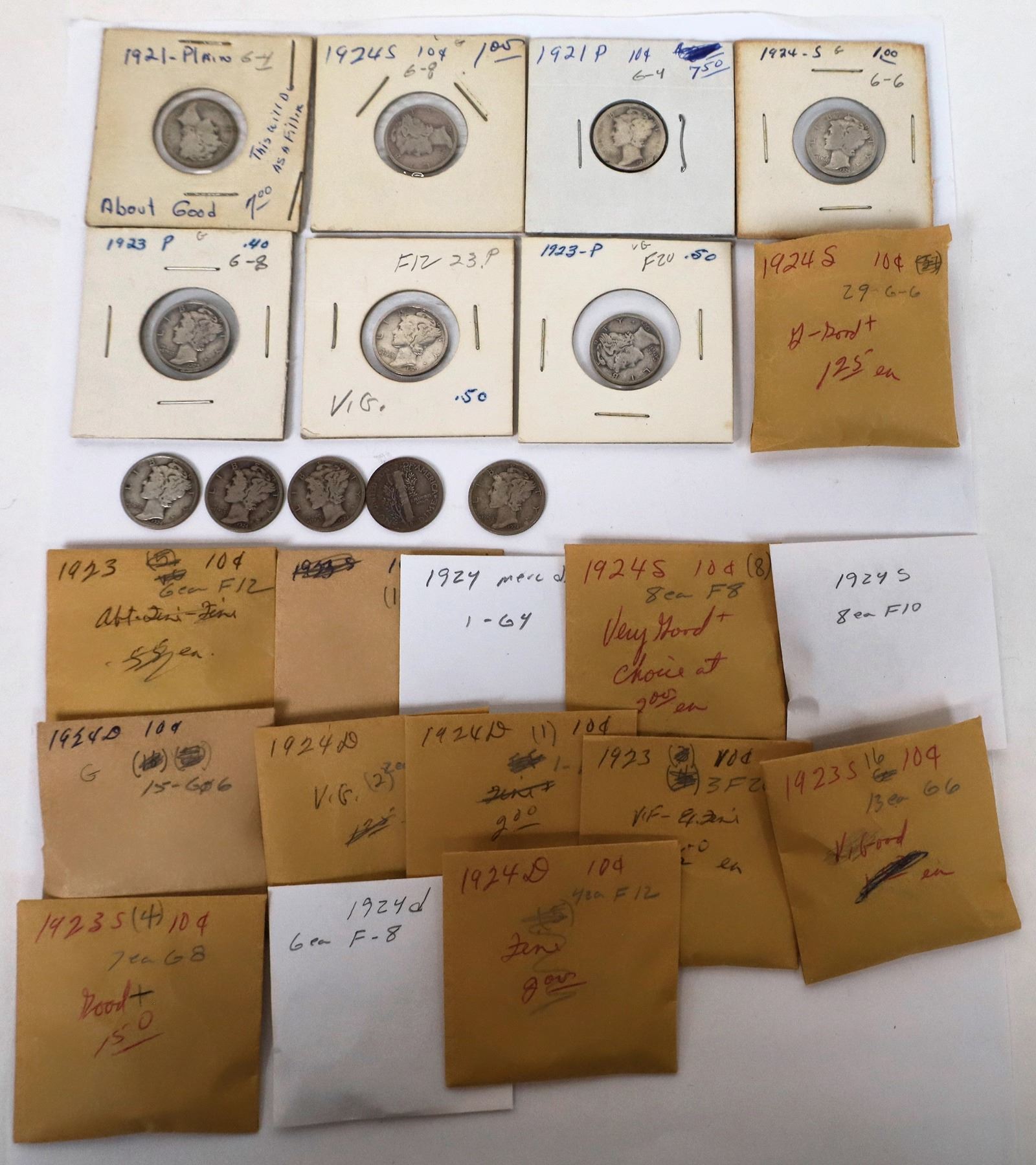 Mercury dimes minted between 1921-1924: 1921 (2: AG, G); 1923 (12: 1 G, 11 F); 1923-S (20 G); 1924 (7: G, VG, 5 F); 1924-D (28: 15 G, 13 F); 1924-S (47: 31 G, 16 F). Total of 116 silver dimes.