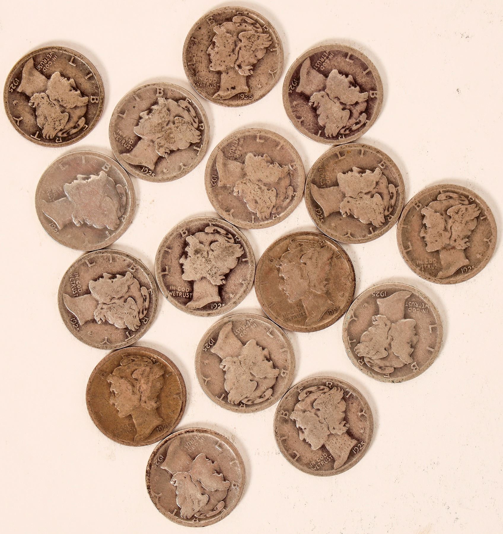 Average circulated (G-VF) Mercury dimes dated 1925 (16 coins): Philadelphia (12); San Francisco (4).