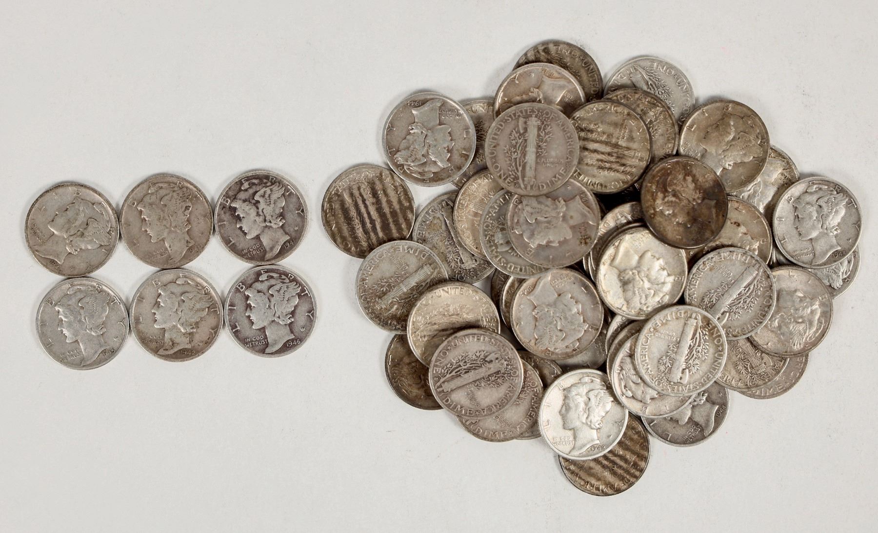 Fifty eight circulated Mercury dimes from the 1940s. G to AU condition.