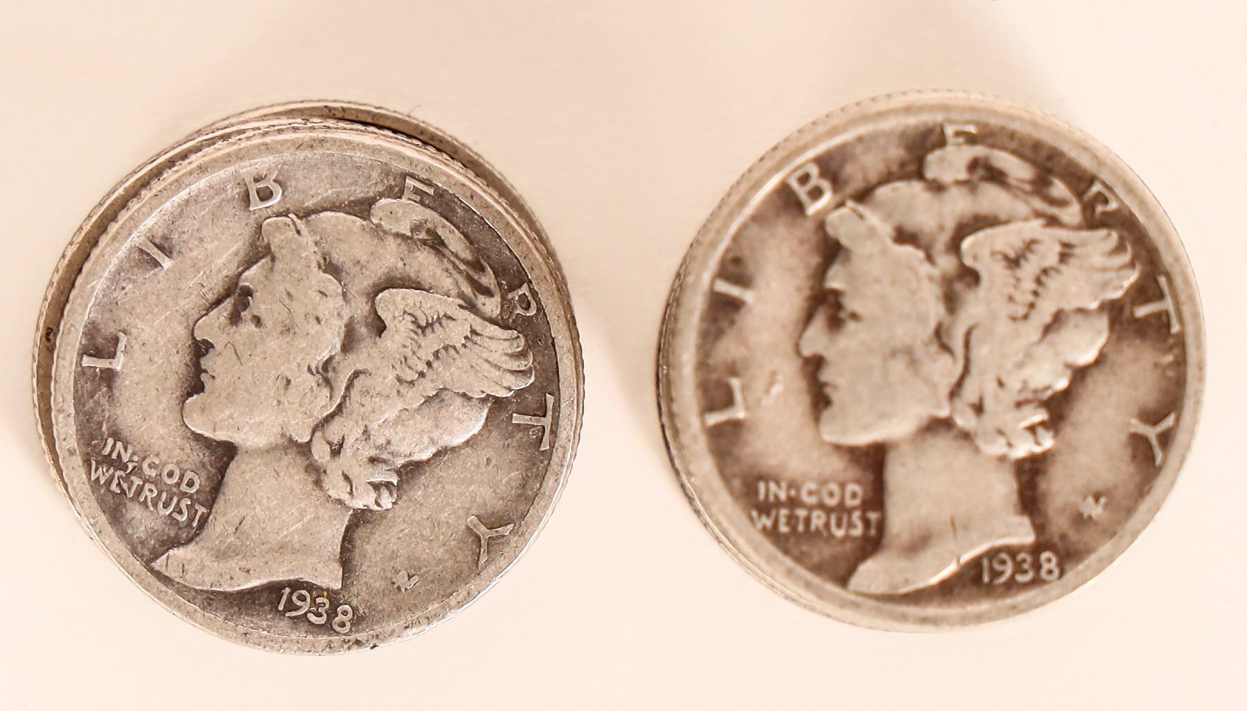 Mercury dimes dated 1938: Philadelphia (14); Denver (5) and one San Francisco. Average circulated condition, G-EF.