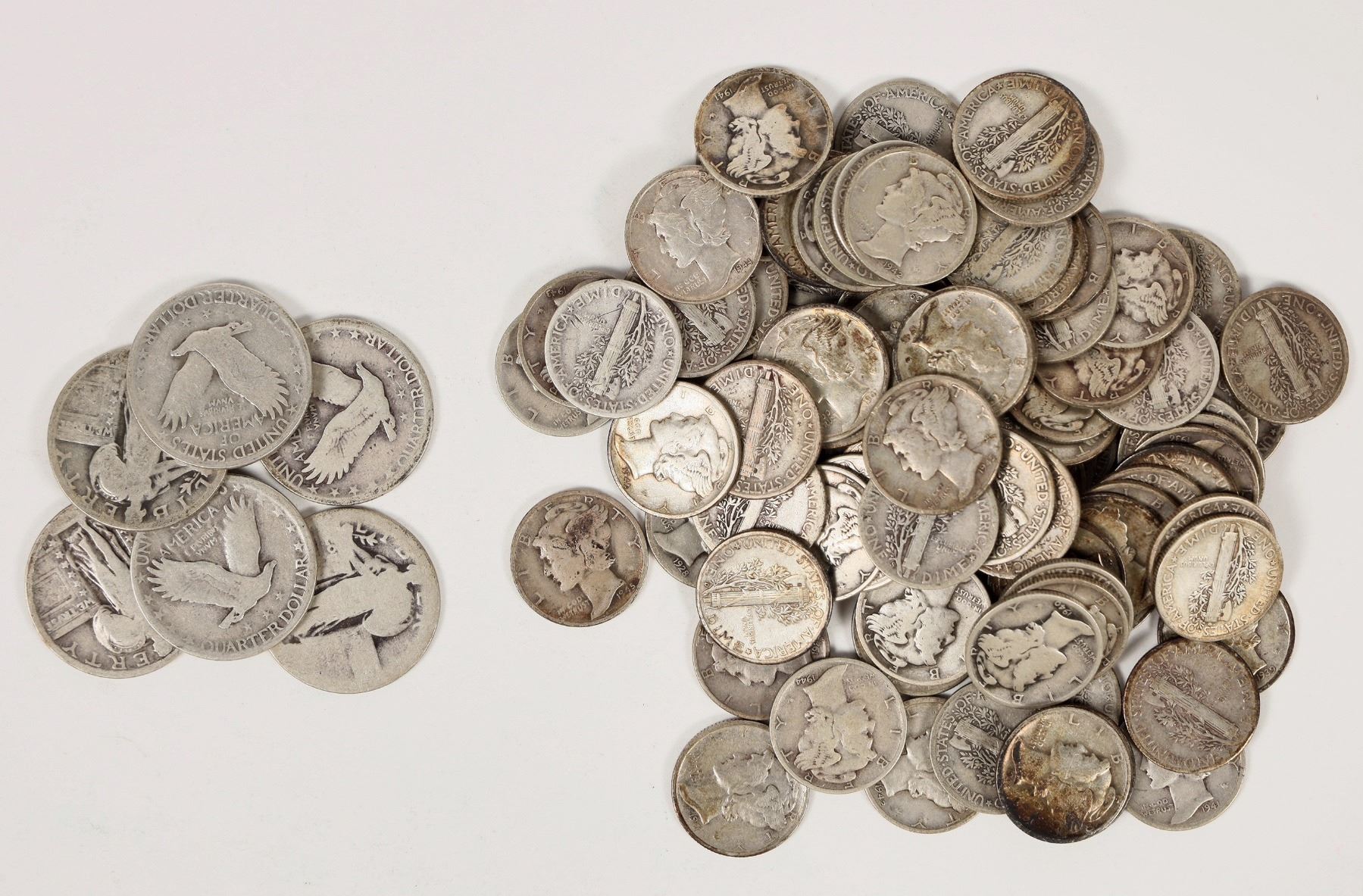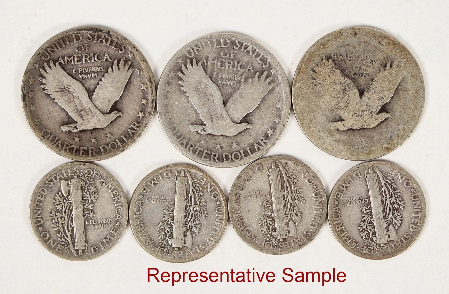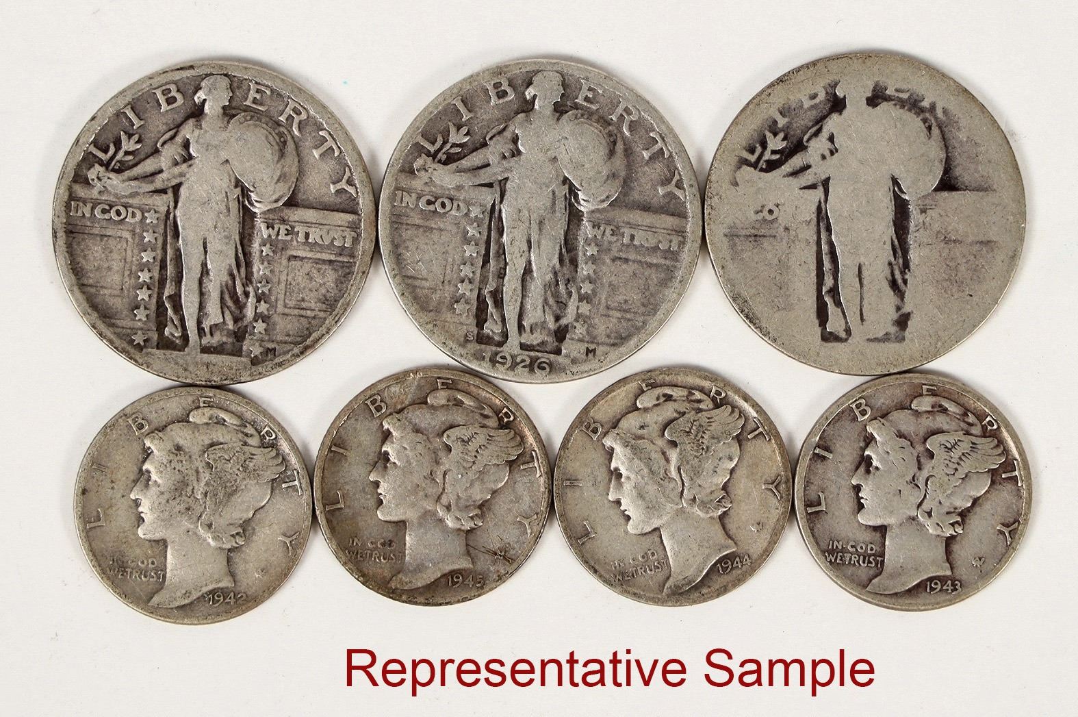 Six Standing Liberty quarters, three with legible dates; 88 Mercury dimes.