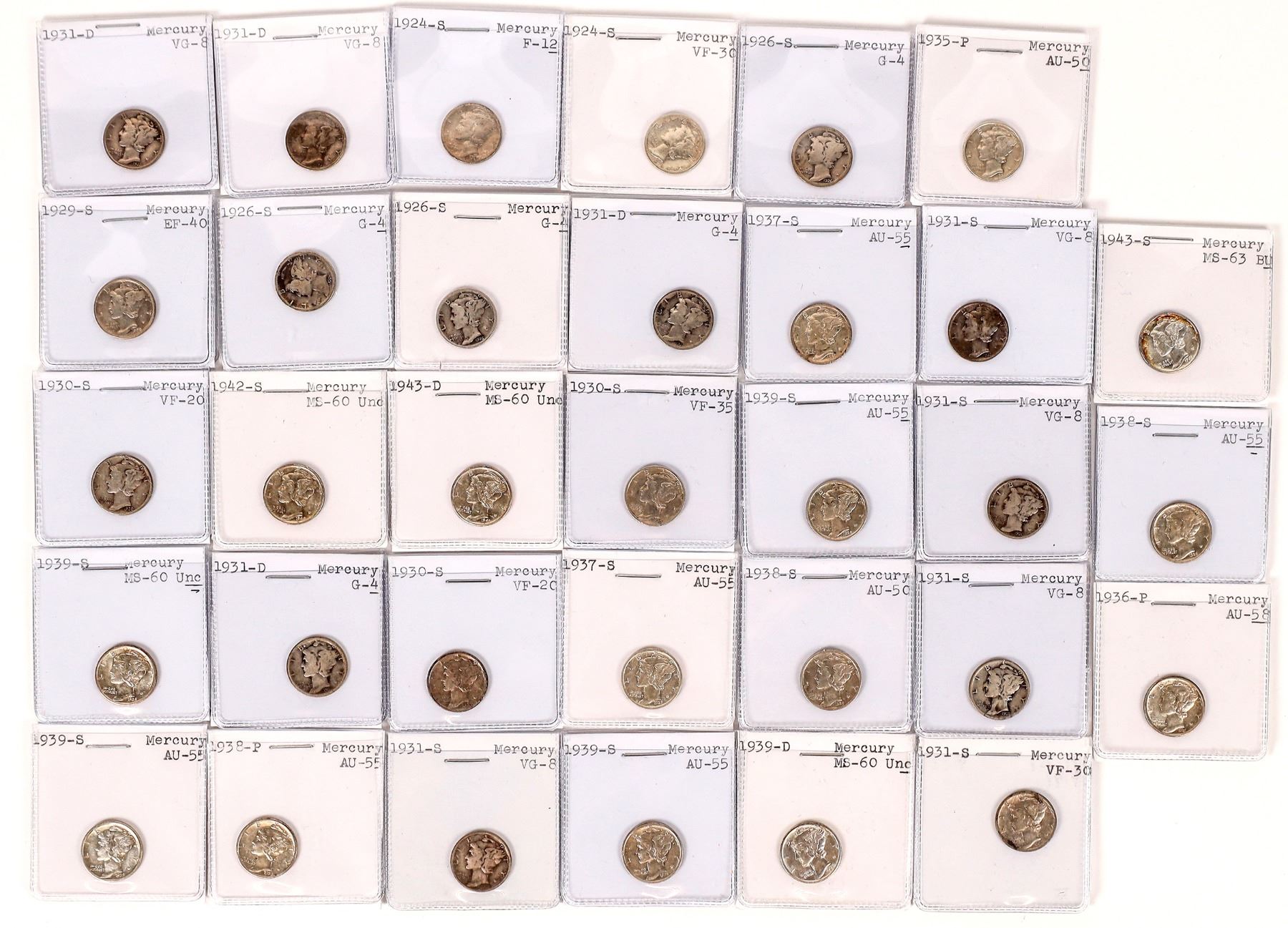 Dealer lot of 32 Mercury dimes in 2 x 2s, dated and graded for your inventory: 1924-S (2: F-VF); 1926-S (3) G; 1929-S EF; 1930-S (3) VF; 1931-D (4) G-VG; 1931-S (5) VG-VF; 1935-P AU; 1936-P AU; 1937-S AU; 1938-P AU; 1938-S (2: AU); 1939-D MS 60; 1939-S (4) AU-BU; 1942-S MS 60; 1943-D MS 60; 1943-S MS 63.