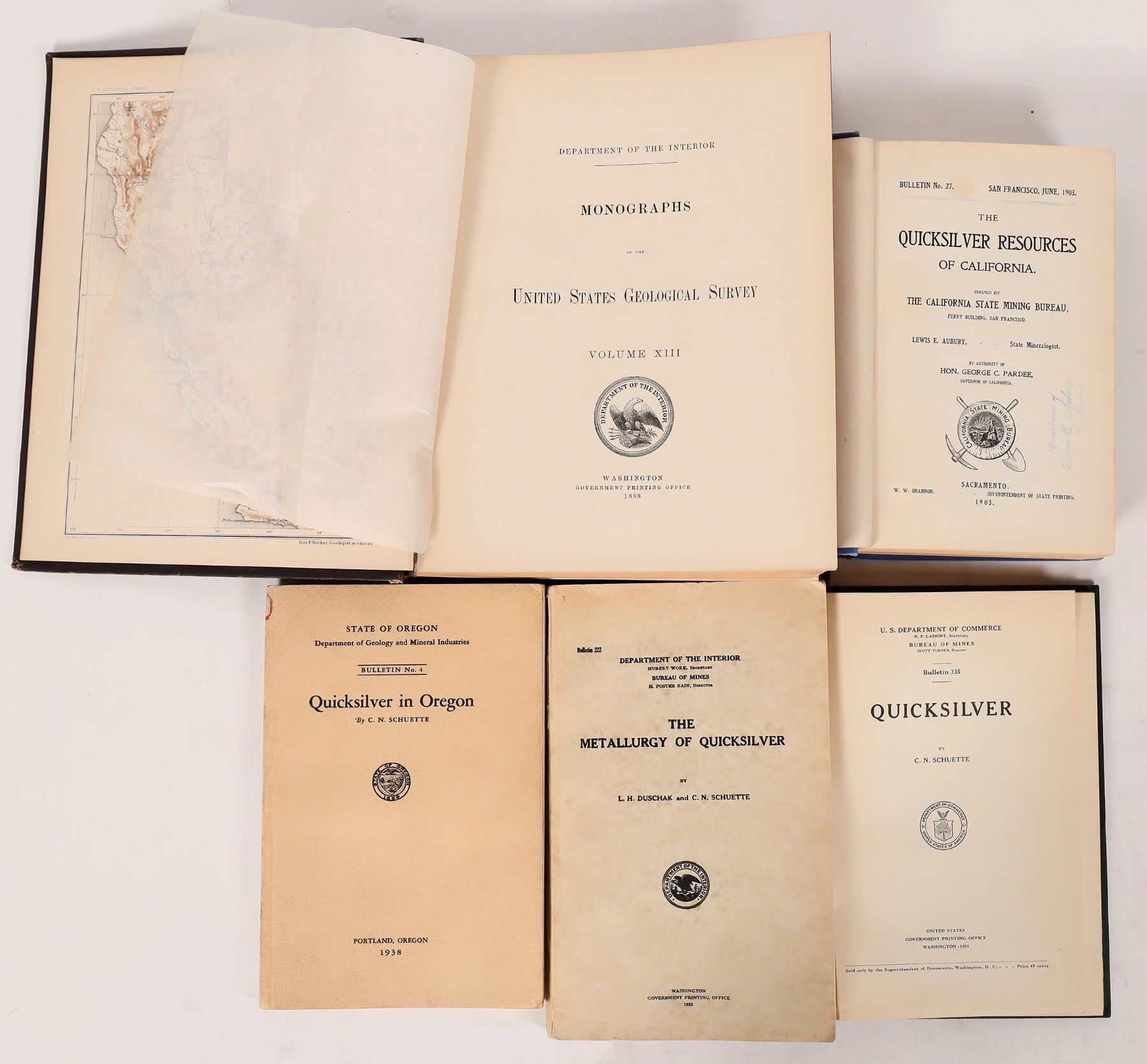 5 mercury reference books. Geology of the Quicksilver Deposits of the Pacific Slope by Becker, 1888, 486pp with index and California map. Quicksilver Resouses and Petroleum of California, 1903, 230pp with index and foldout petroleum chart. Metallurgy of Quicksilver by Duschak, 1925, 173pp with index. Quicksilver in Oregon by Schuette, 1938, 172pp with index, several foldout maps and equipment drawings. Quicksilver by Schuette, 1931, 168pp with index, map and equipment foldouts. GO TO THE BOOKS SECTION OF THIS AUCTION FOR OTHER IMPORTANT MINING REFERENCES AND MINING-RELATED WORKS.
