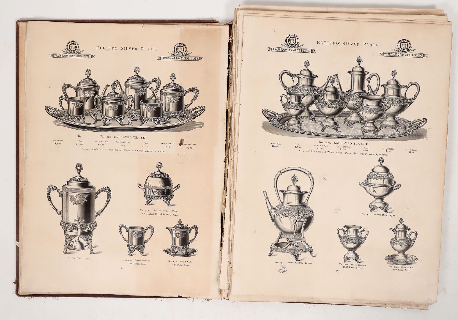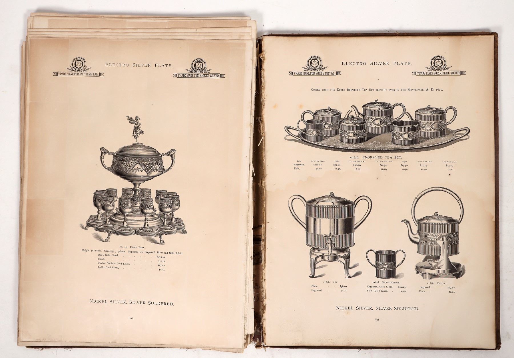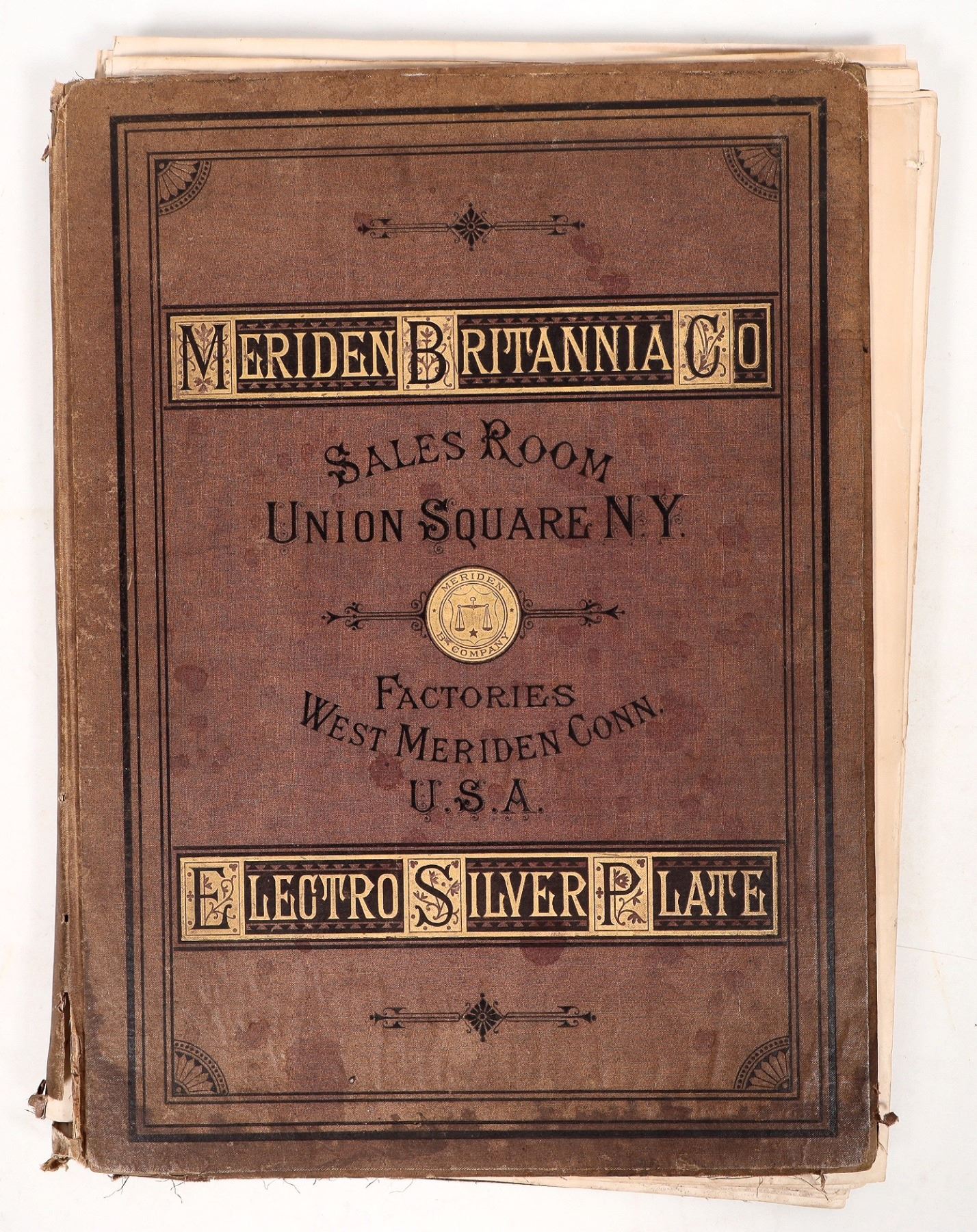 We have never seen one of these before. Meriden Britannia Electro Silver Plate bound catalog with nice full page wood engraving of their factory.78pp with index, 94pp are detached from binding. They used silver electroplate on white metal and gilt plate over nickel and silver. Front and back fly leaf are not present. Water stains, toning, some paper residue, spine issues. 17x12". Please inspect.