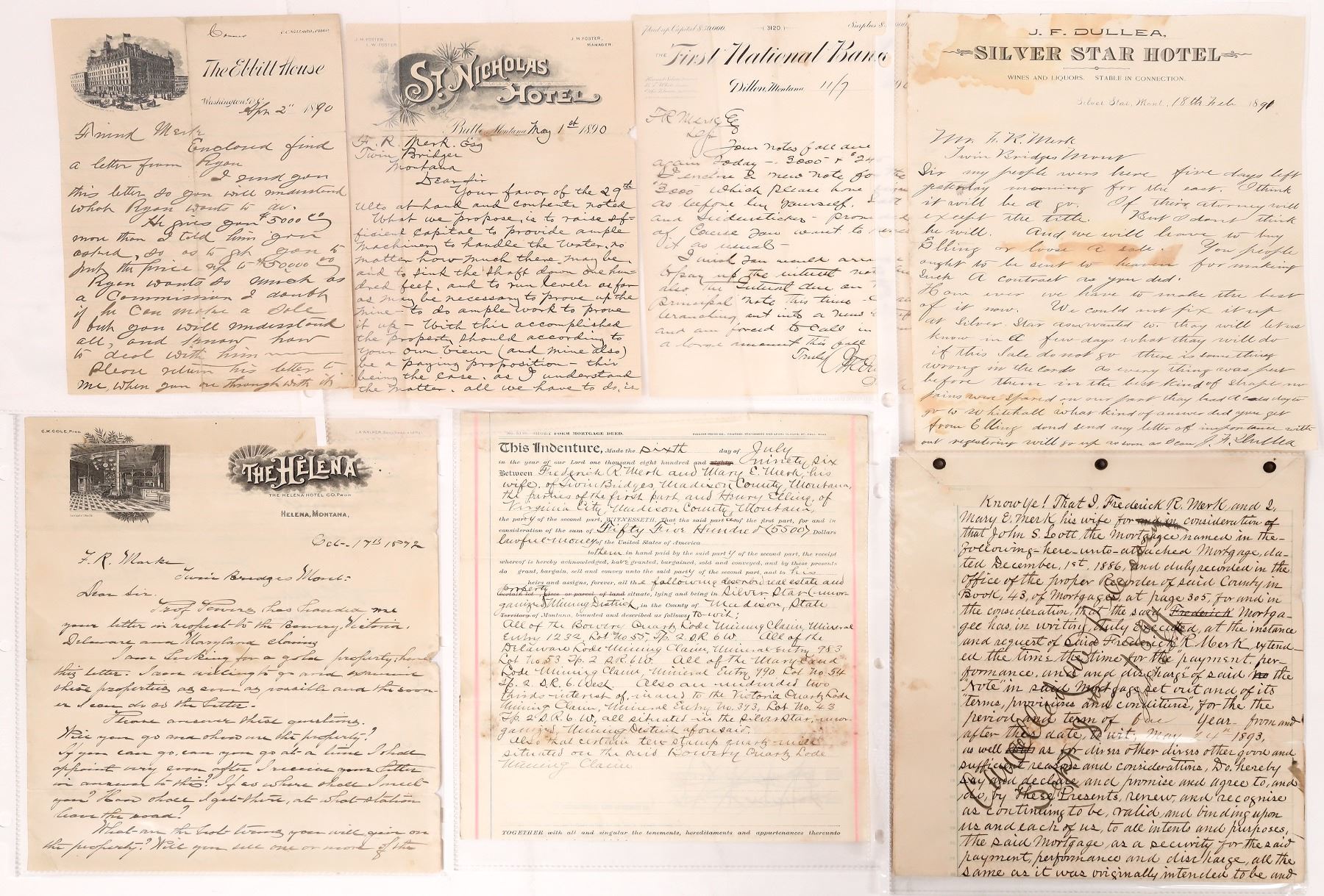 Collection of 200 or more letters to and from Fred R. Merk Esq., c. 1890-1900. 200 or more letters c. 1869-1906 from Ella Merk to her parents. Fred Merk lived in Twin Bridges, Montana and was involved in the quartz mining industry. He was a partial owner and superintendent of the Broadway Mill Company, a mining operation near Silver Star. These letters primarily contain information about his professional endeavors and family matters. These letters can provide hours of interesting reading about Merk who lived during the early development of the American West, specifically Montana. All letters are contained in 3 three-ring binders with plastic sheets, 12.25 x 11.5 x 3.5 inches. Twin Bridges Montana Stuart Mackenzie Montana Ephemera Collection