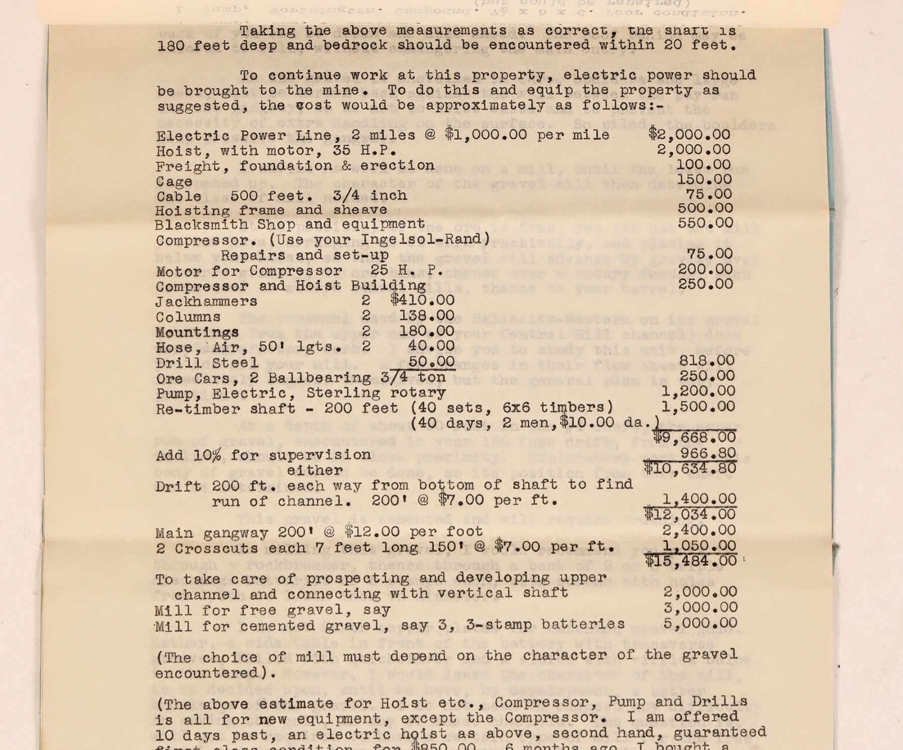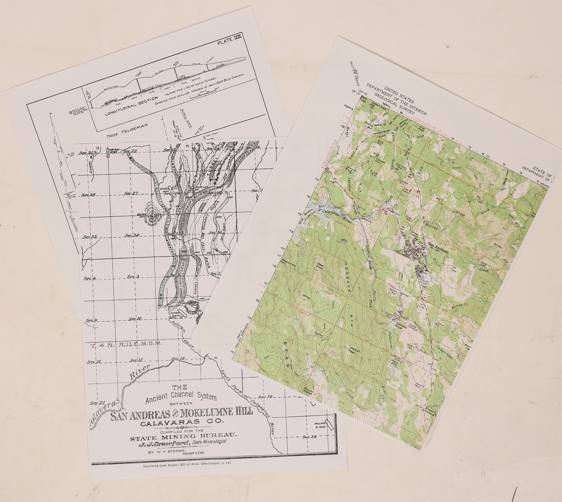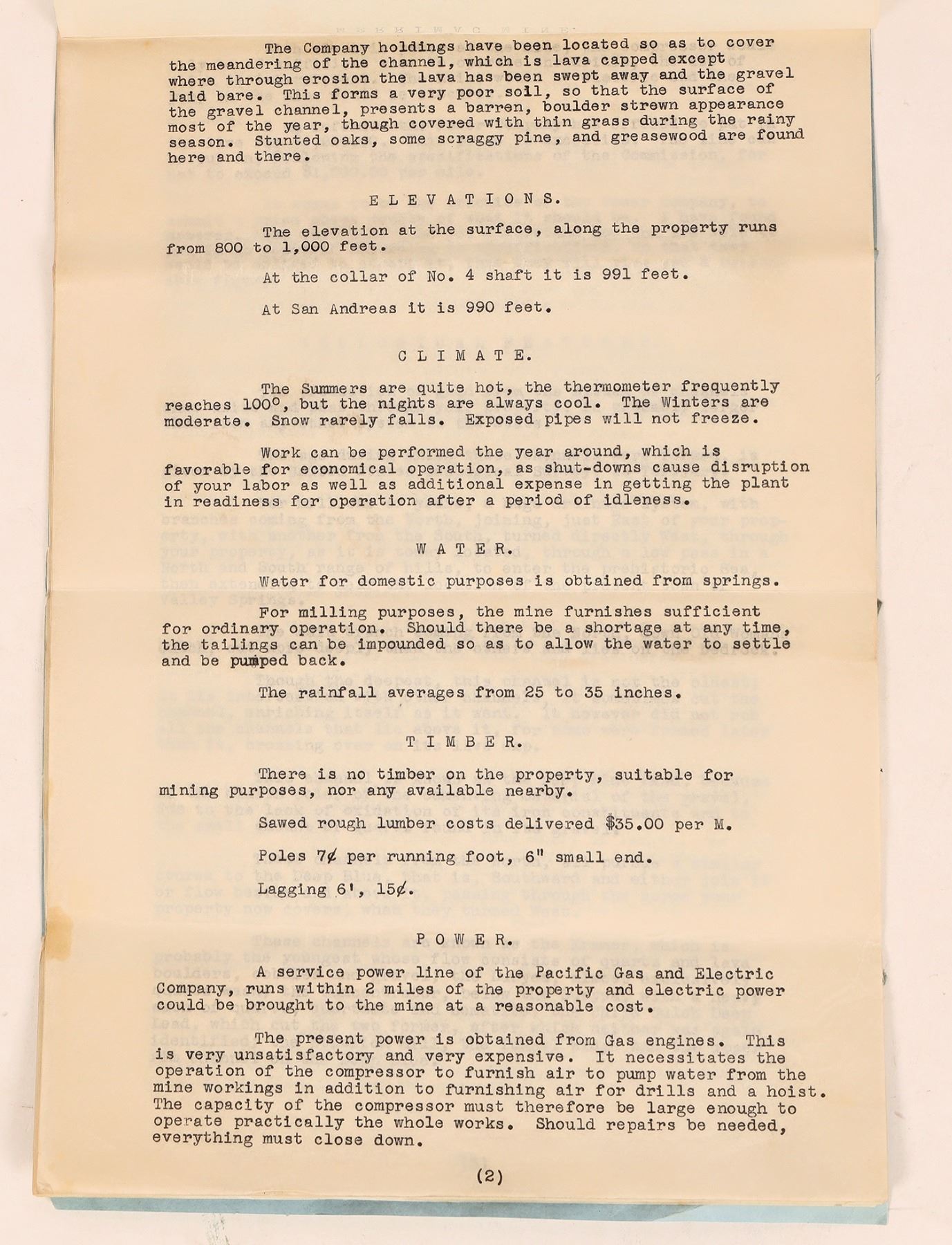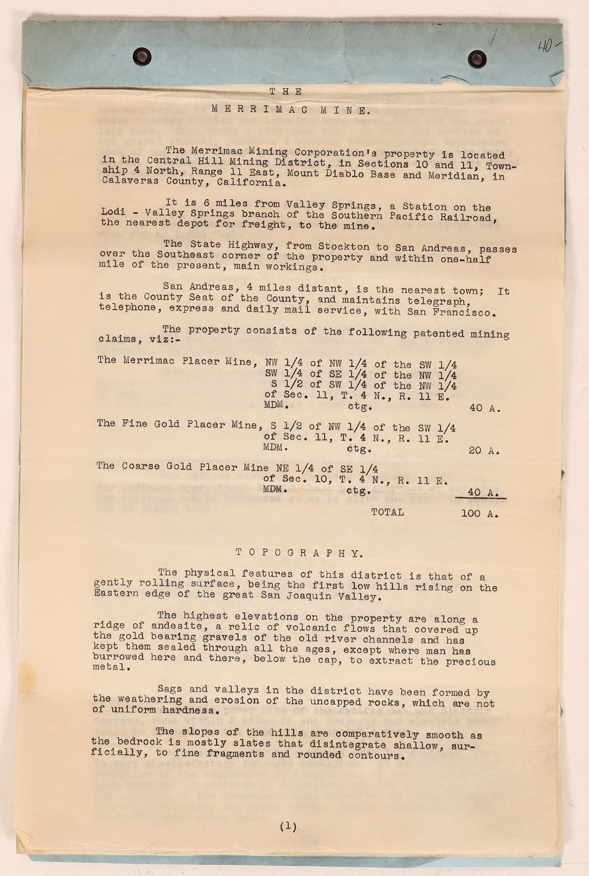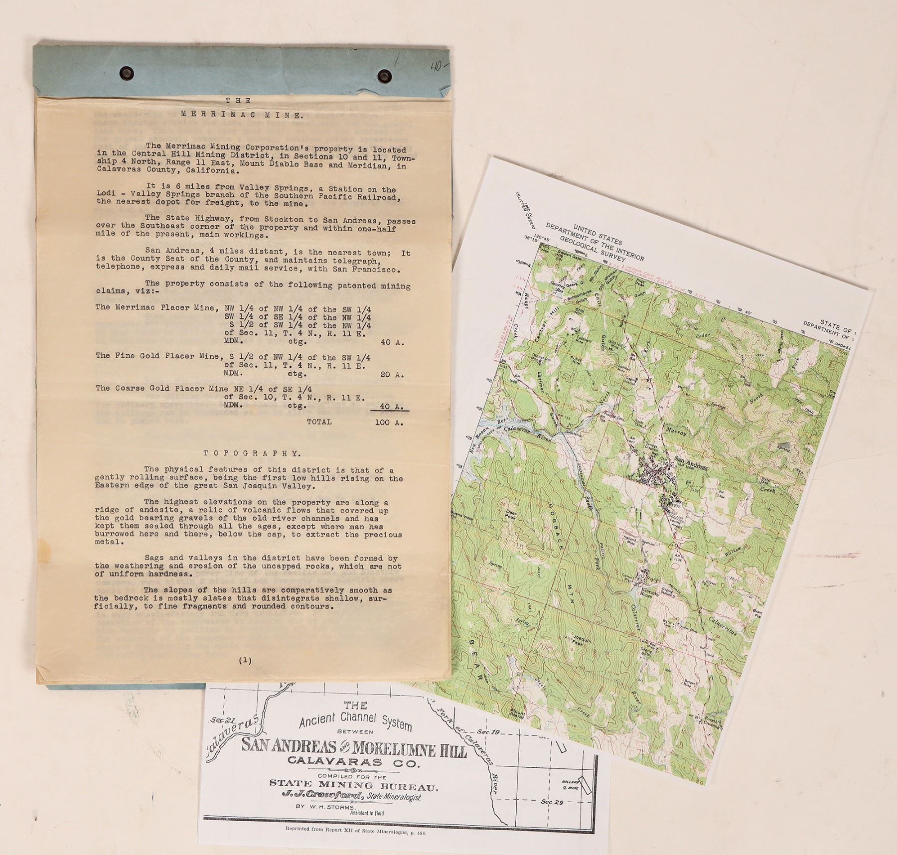 Undated report on Merrimac Mine in the Central Hill Mining District in Calaveras County. Consists of 3 patented mining claims-Merrimac, Fine Gold and Coarse Gold, all placer mines. 11pp detailed report on this mine in the renowned "Deep Blue Lead" channel that covered over 100 acres with 3 maps.