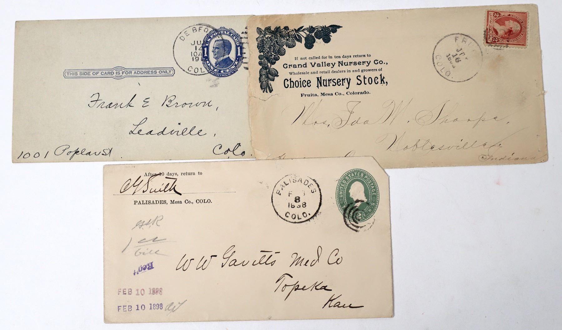 Lot of 3. 1) Palisades (1891-1924). Corner ad cover sent to Topeka. Palisades, Colo. Feb. 8, 1898 postmark. Target killer. Name changed to Palisade in 1924. 2) Pictorial corner ad cover for Grand Valley Nursery Co., Fruita, Colorado. Vignette of fruit. 1892 Fruita postmark. 3) De Beque. Postal card with 1 cent McKinley blue stamp, De Beque 1912 cancel.