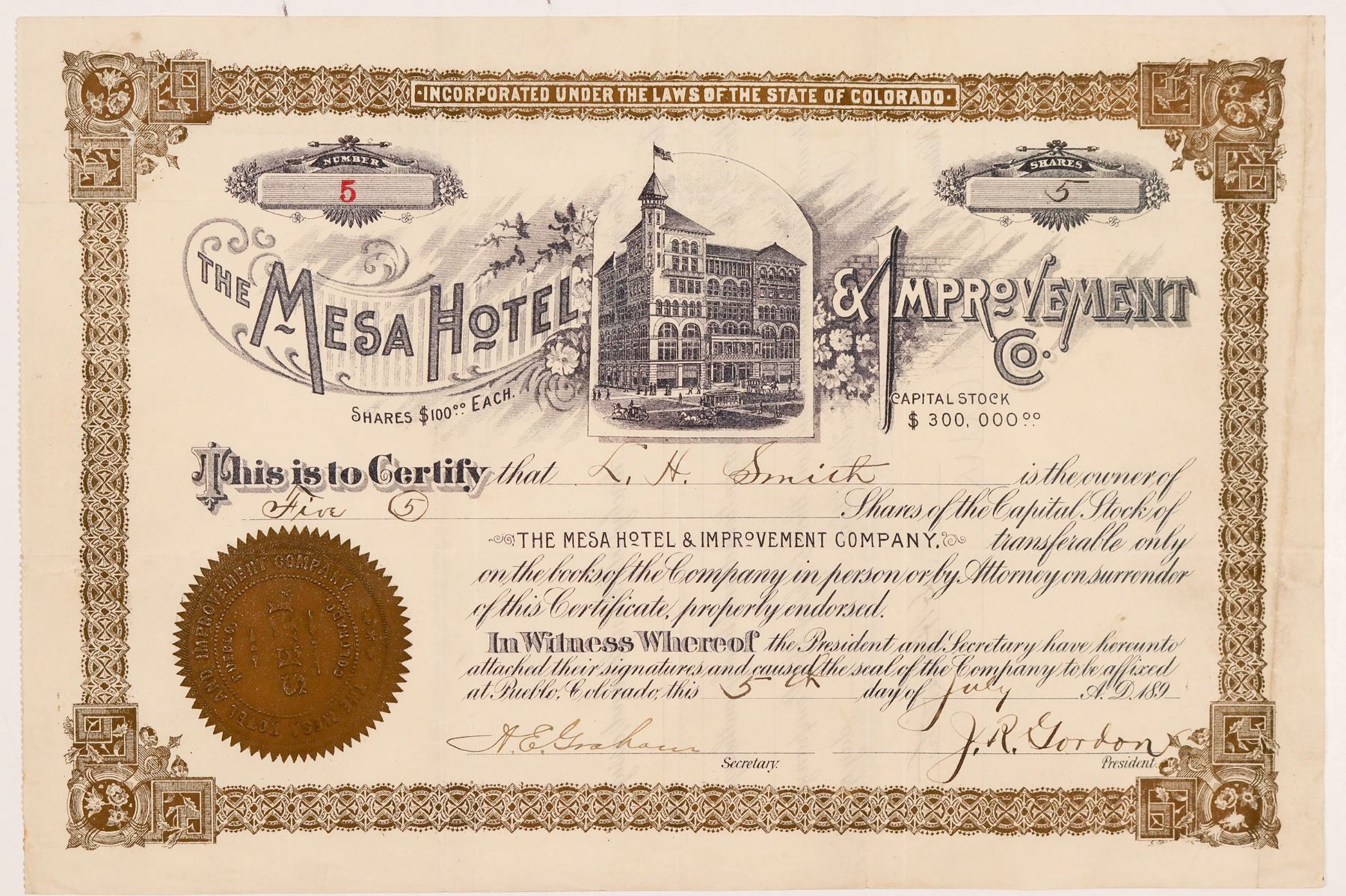 Inc. in Colorado. Low number 5, issued for 5 shares to LH Smith on July 5th, 1893 in Pueblo. Signed by president JR Gordon and secretary Graham. Not cancelled. Gold border and seal, ornate title with floral vignettes and a central vignette of the hotel. No printer listed. Pinholes, folds, creases, some toning and soiling. 7.5 x 11.25" This hotel was being built at the corner Abriendo Avenue and Broadway in Pueblo. However, on Oct. 9th, 1893--just 3 months after this stock was issued--it was destroyed by a fire. They believe the fire was started by cigarettes. JR Gordon said they were 6 weeks from finishing construction. [Colorado Daily Chieftain, October 10, 1893] Ken Prag Collection