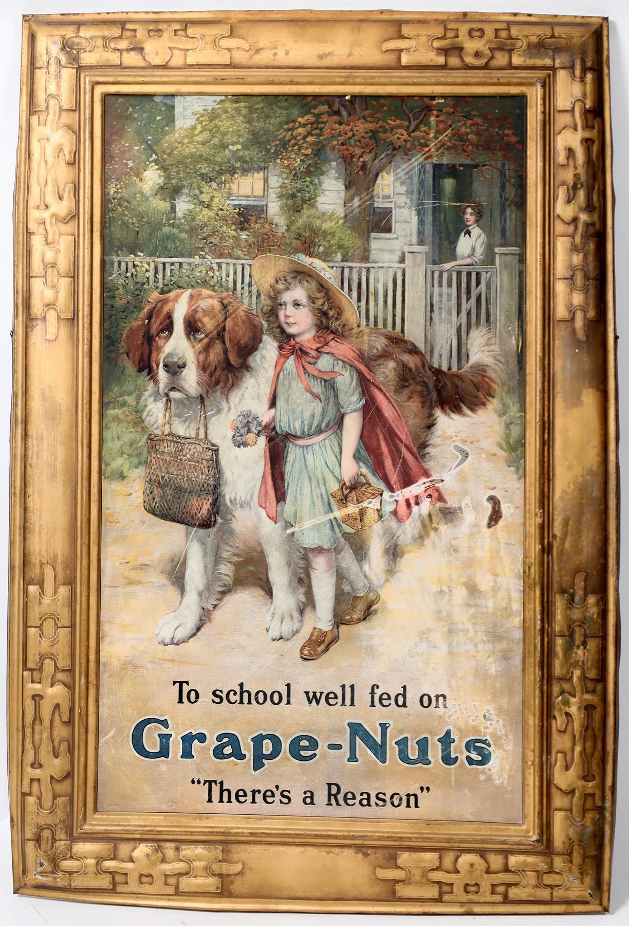 Single piece metal advertising sign for Grape Nuts. Embossed frame section. Young girl with a large dog on the way to school under the watchful eye of her mother. 31x20". Some wear on image, please inspect.