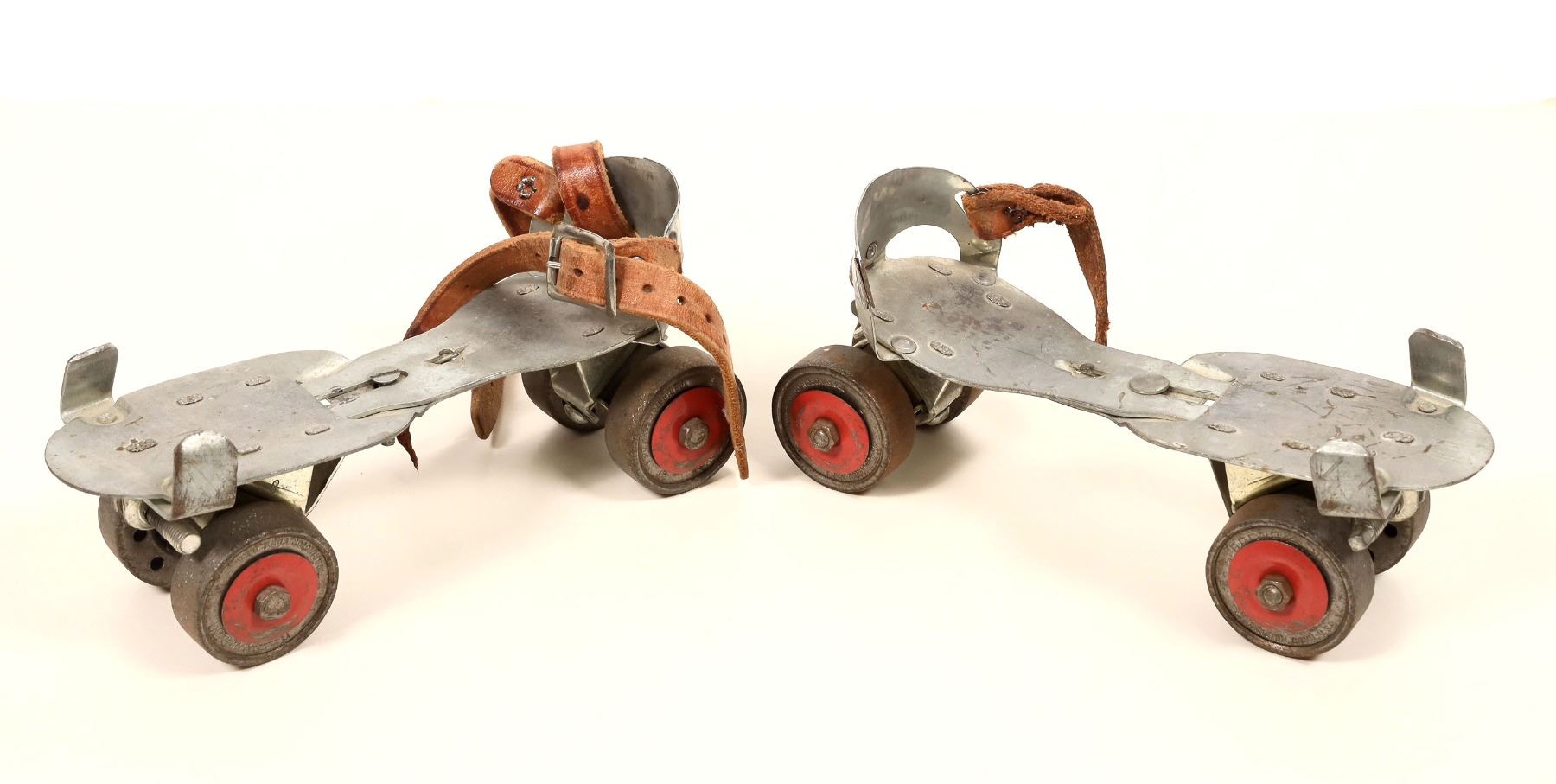 Pair of vintage metal clamp on roller skates with leather straps. 1 strap is broken. Wheels are marked Union Hardware