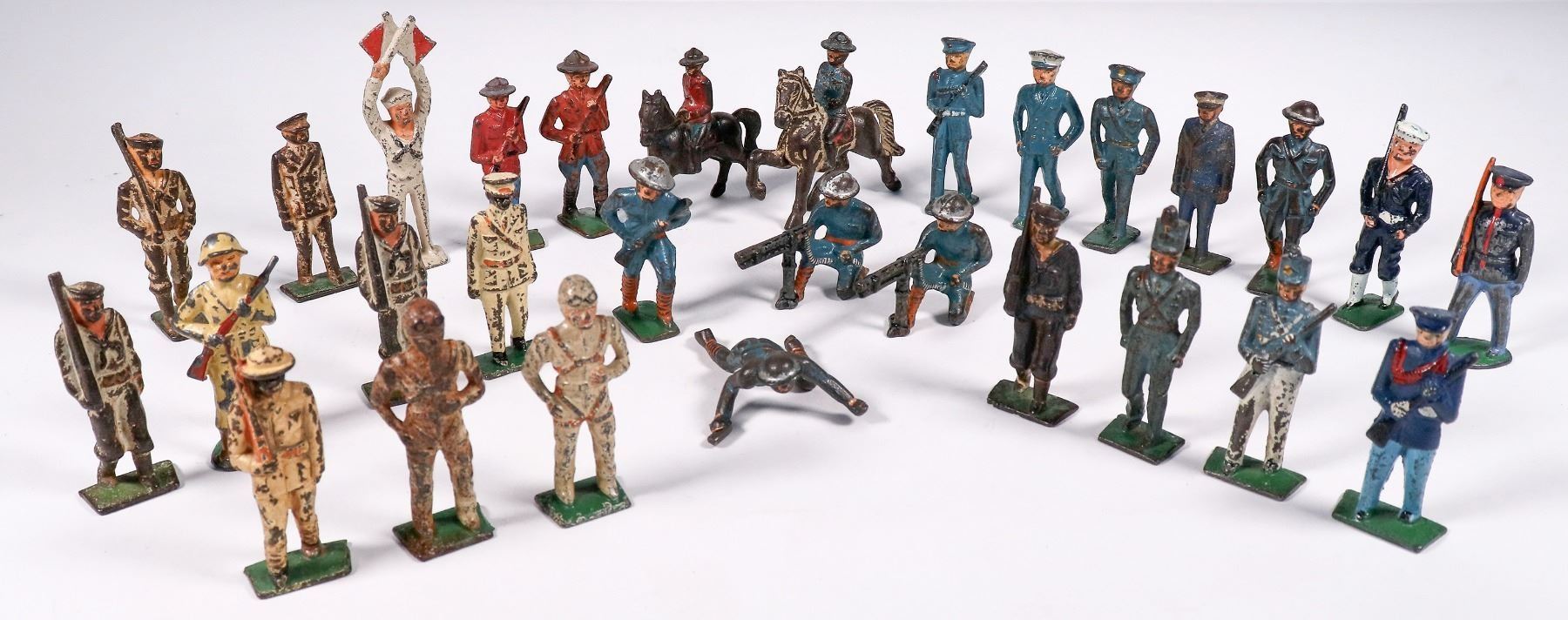 29 iron toy soldiers, red, white and blue uniforms. See photo. About 3x1". Some have wear.