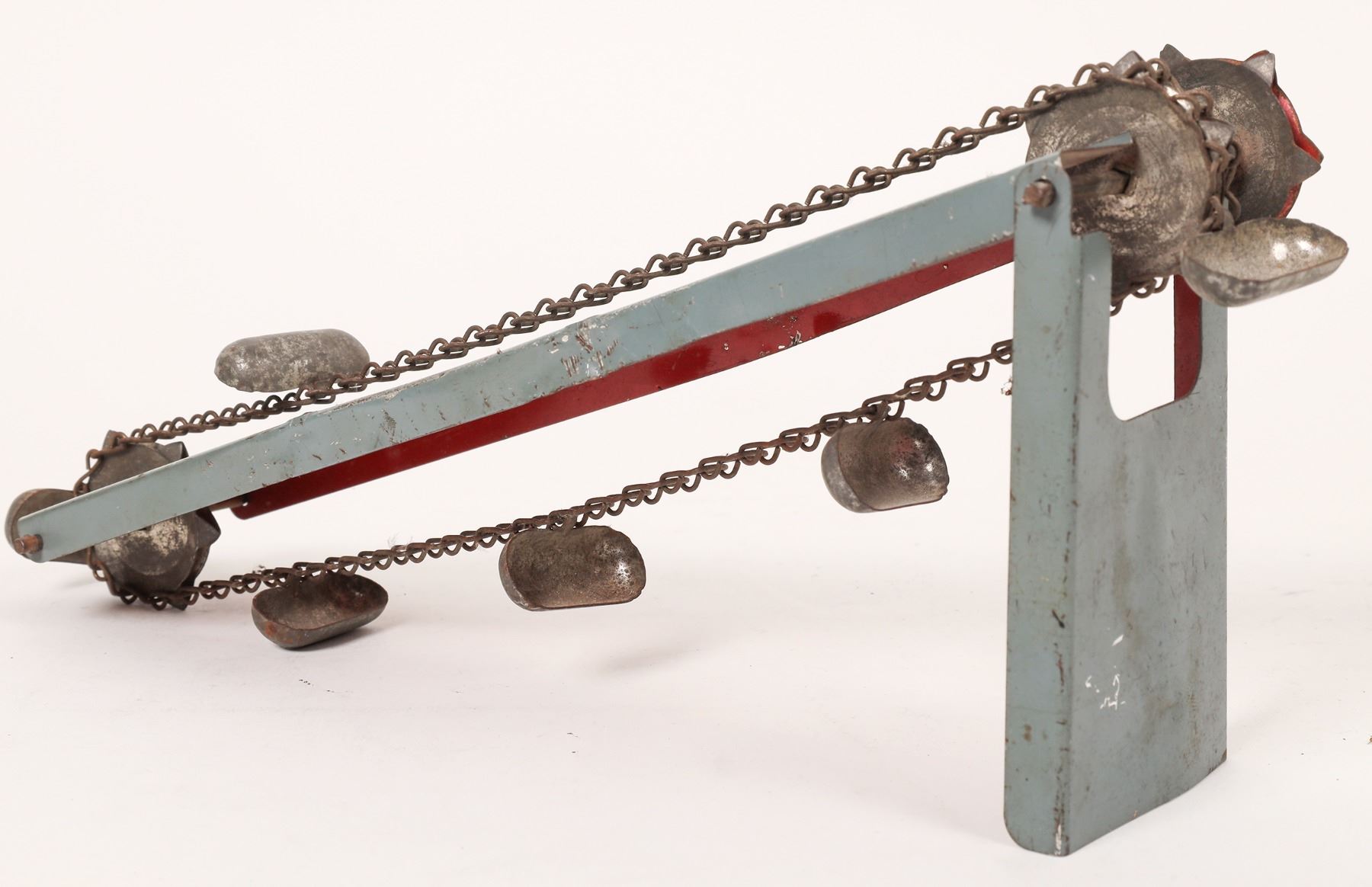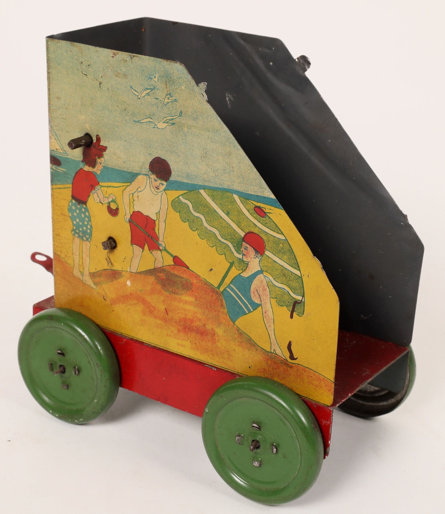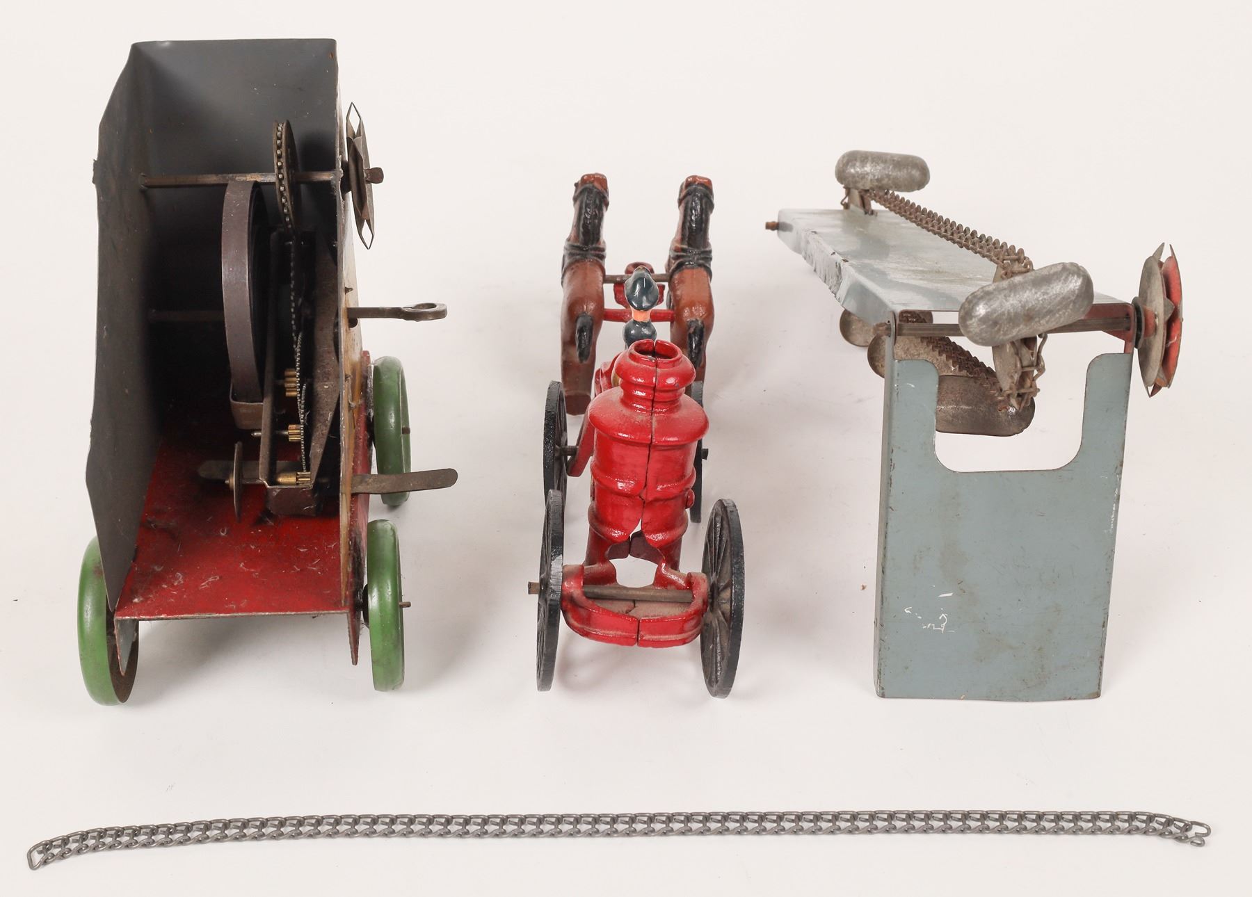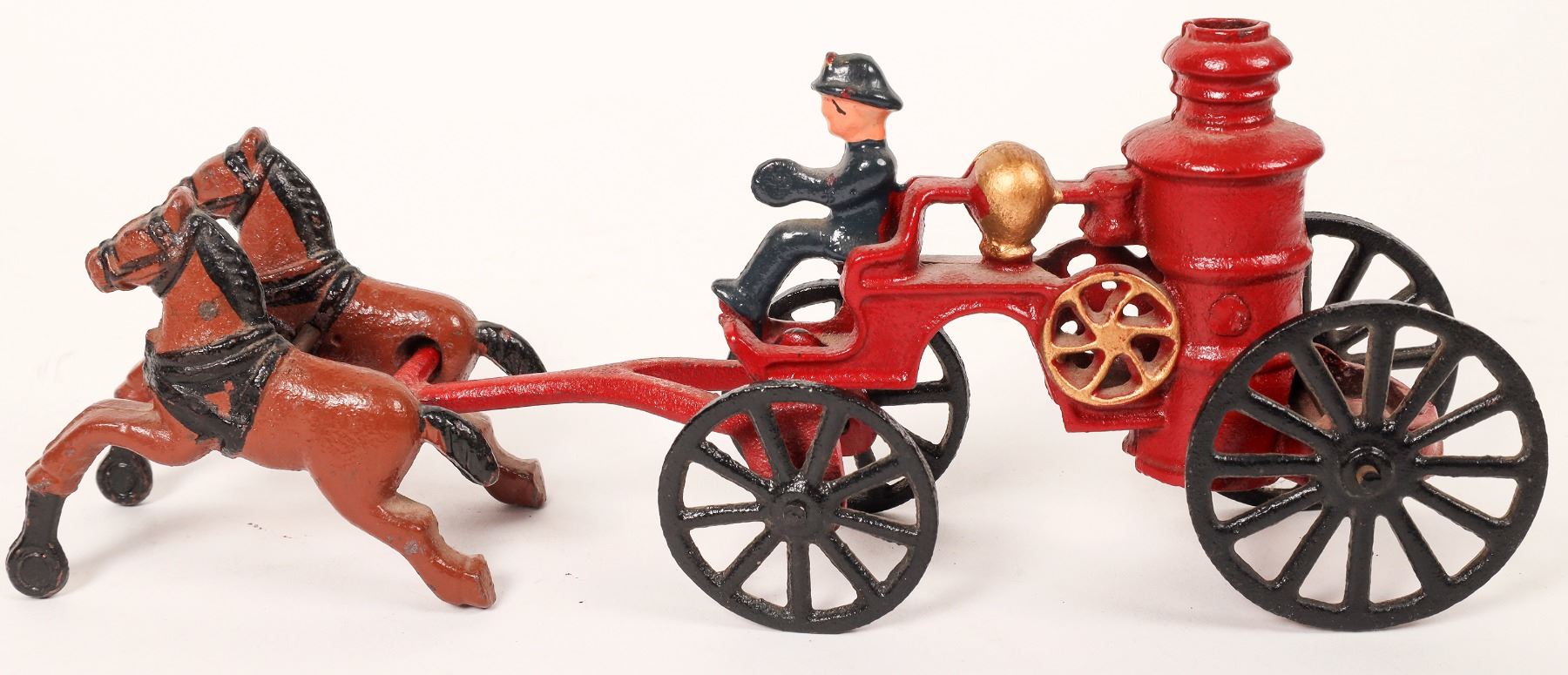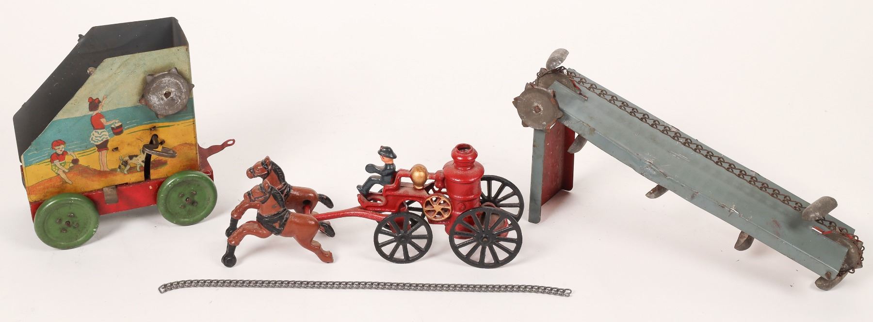 A metal horse drawn fire wagon, with horses and a sand beach toy. Fire wagon with horses, measures about 8" while the sand toy is about 8" tall. Please see photos for more detail.